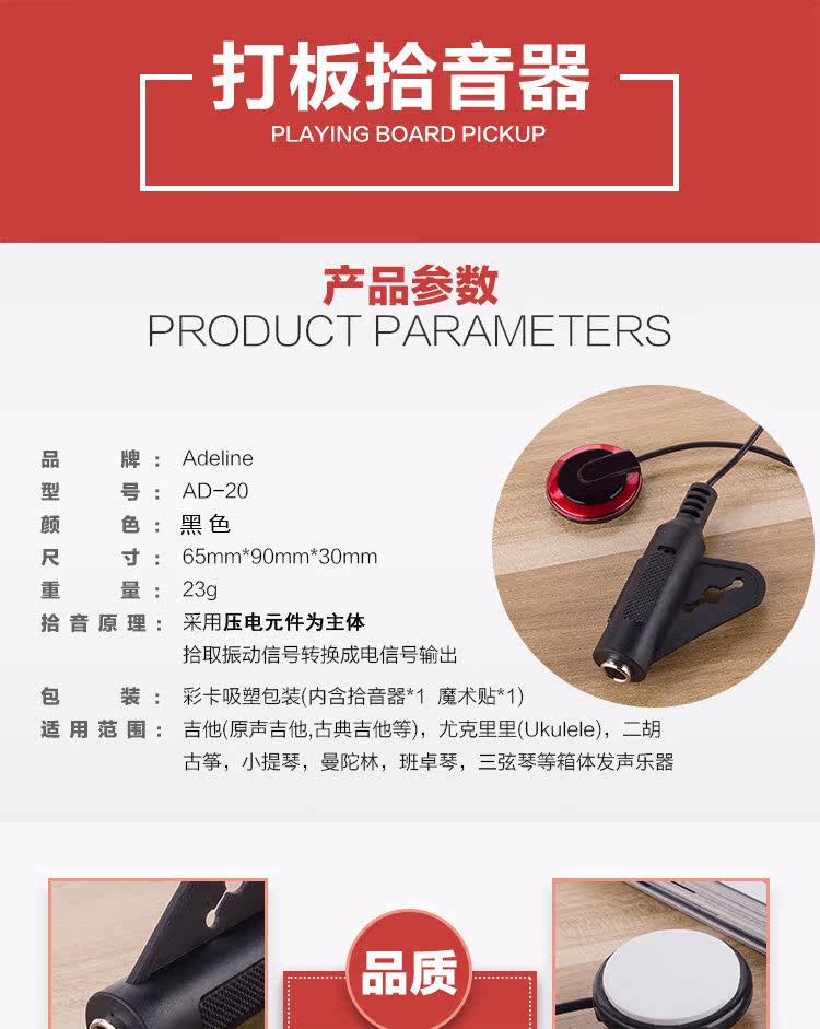 Пикап платы AD-20 может забрать звук коробки для прибора в процессе игры.Qinxian Поиграть ясно!Это может быть использовано в четырех поставках Гавайев, народной гитары, классической гитары, фортепиано, эрху Гучхенга и других деревянных оригинальных звуковых инструментов.