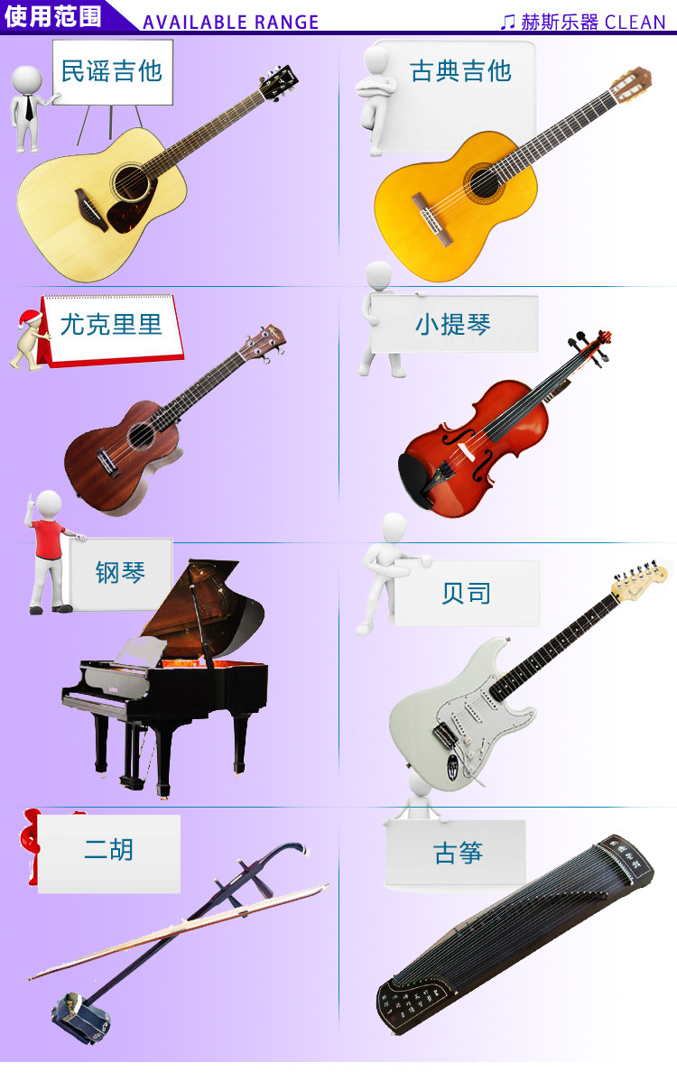 2: Применимые музыкальные инструменты: гитара, большая, средняя скрипка, Гучхенг, Эрху, фортепиано и другие струнные инструменты.