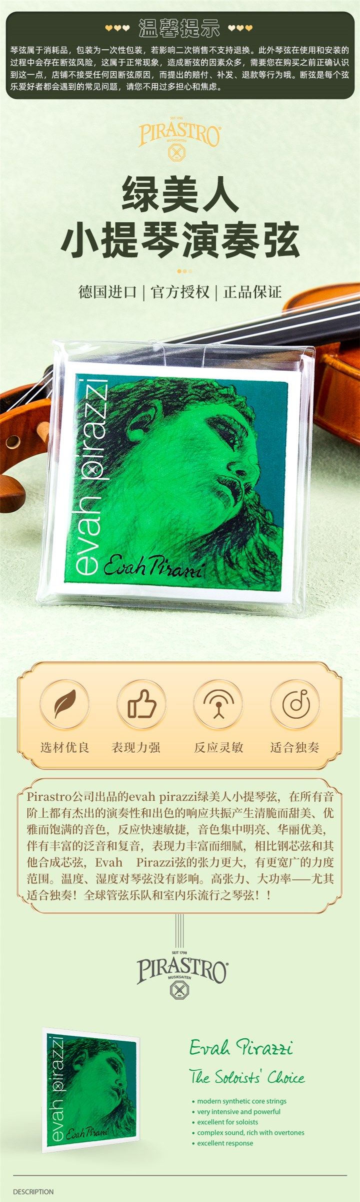Немецкий Pirastro Green Beauty Beauty Stivic String Evah Pirazzi Nyron Strine Core eadg сингл