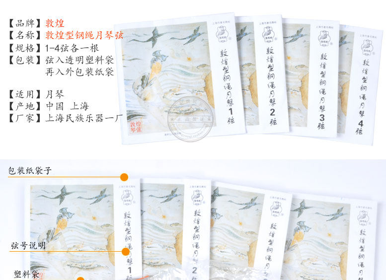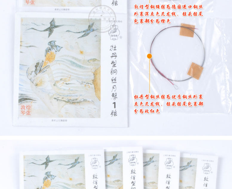 [敦煌琴弦特色 ]&[nbsp;敦煌牌系列琴弦是中国弦乐器的专业配套用弦,被上海市评为著名商标,琴弦采用德国专业钢琴丝,各项物理和声学指标达到国际标准。]