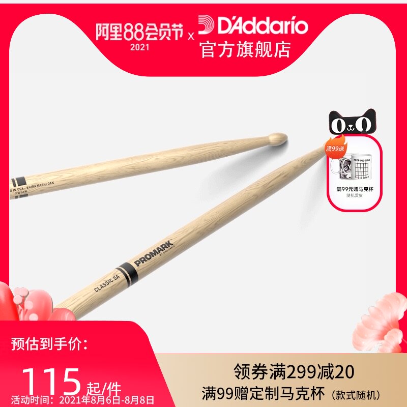 Dadrio Promark 5a Wood Shira Kashi Oak Drum Drum Stick pw5aw