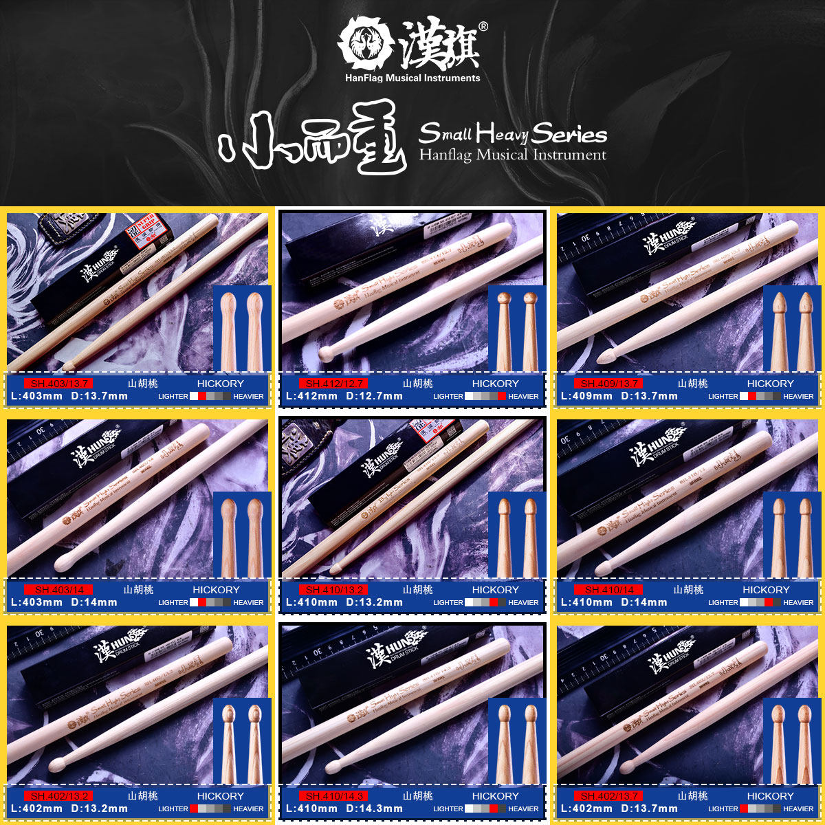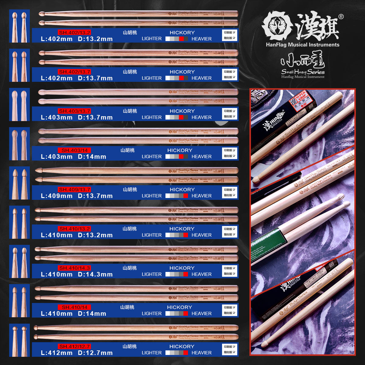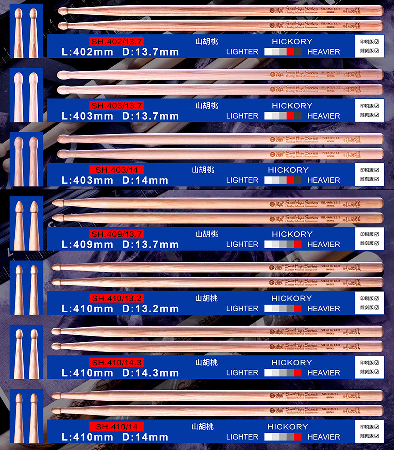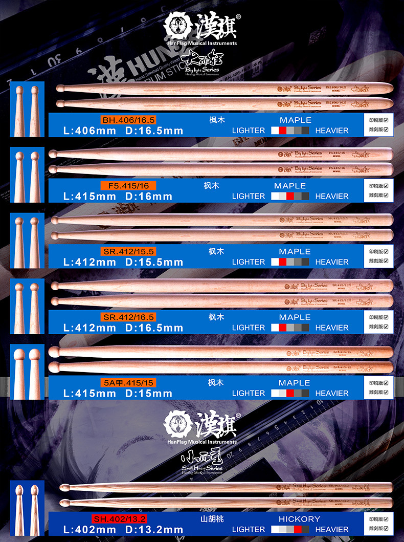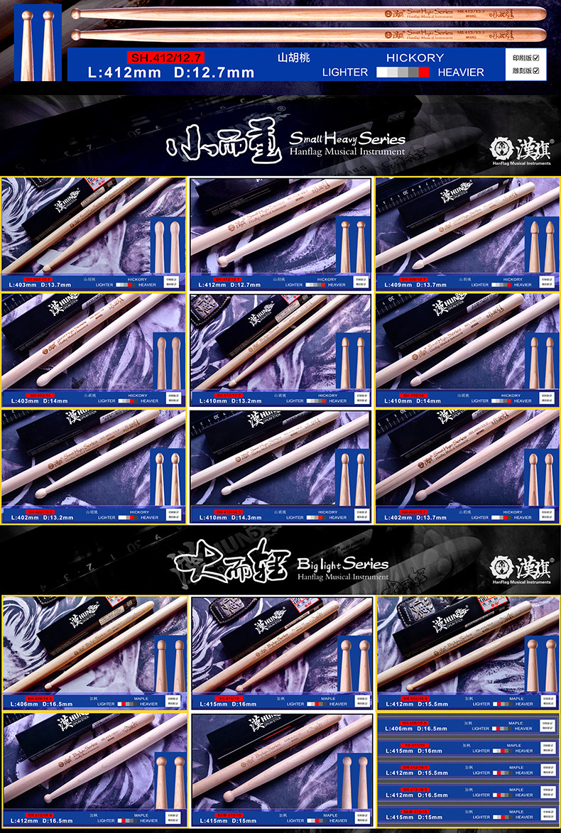 汉旗 Барабанные палочки Барабанные палочки Большие и легкие Маленькие и тяжелые серии