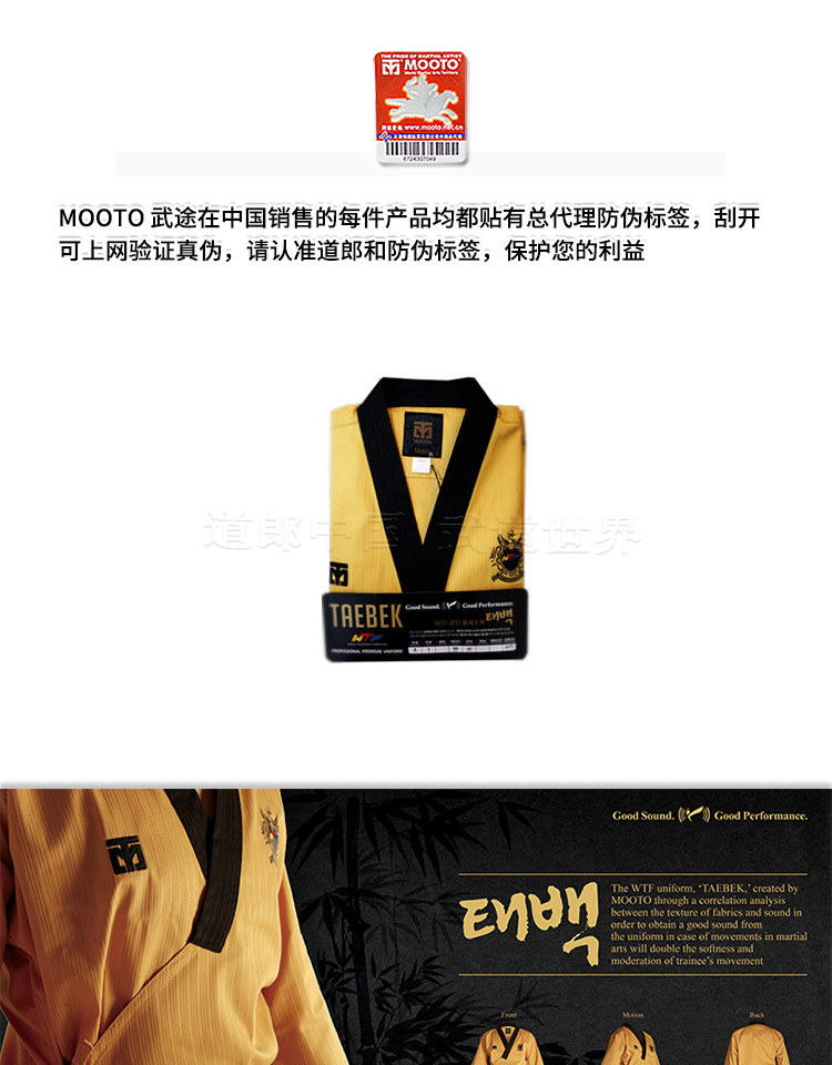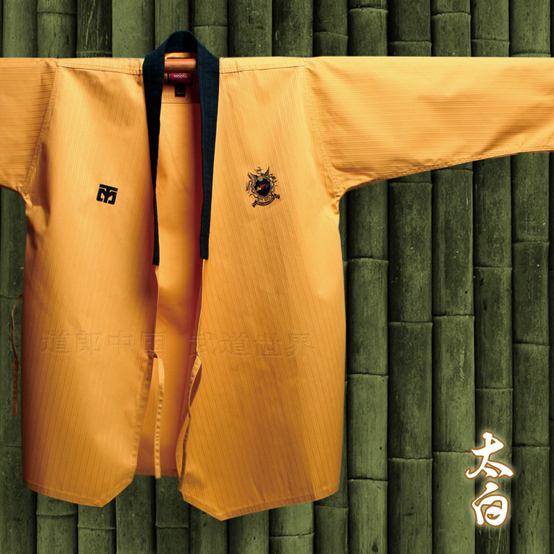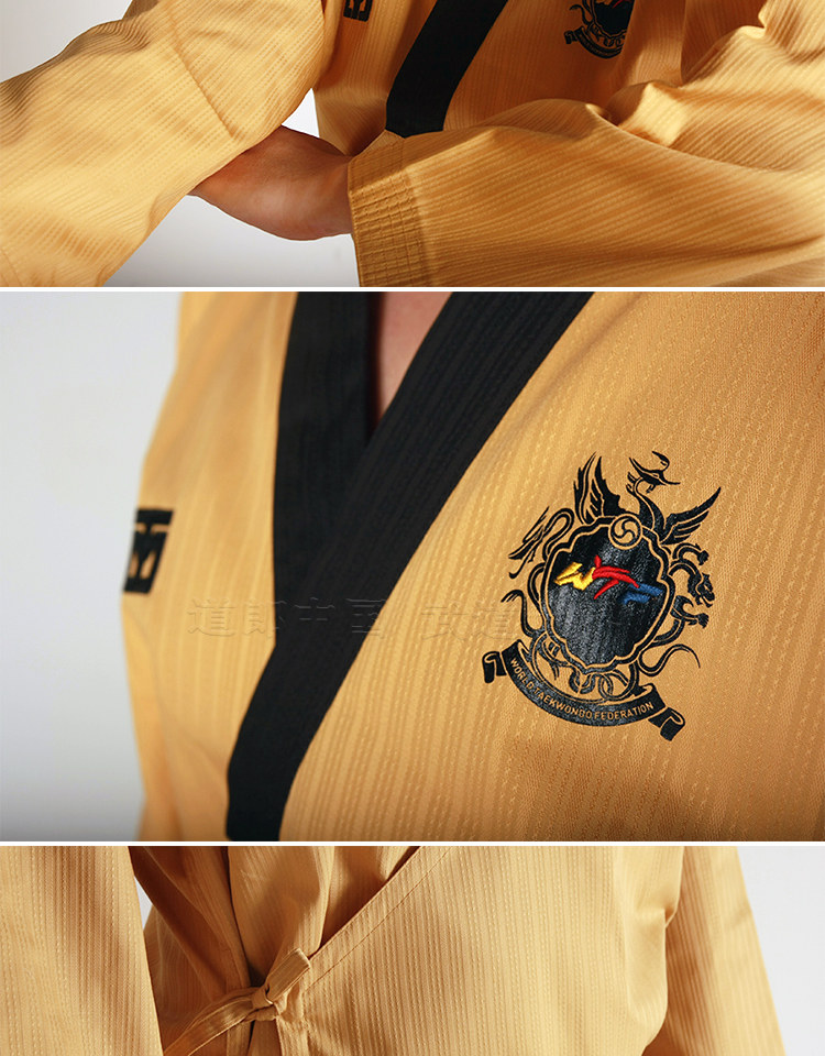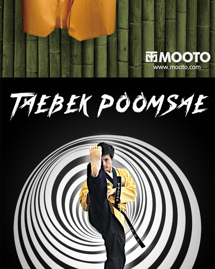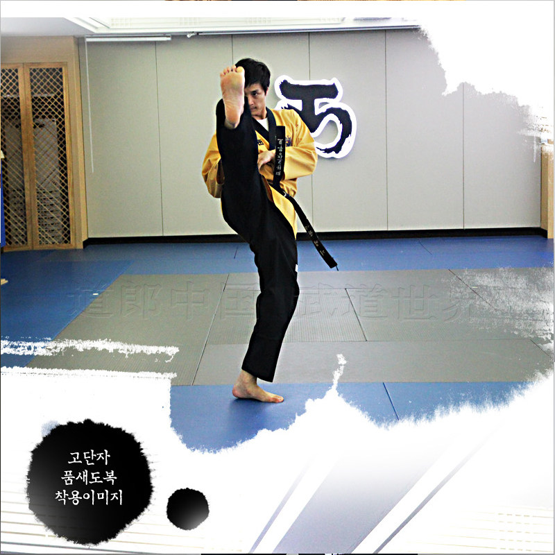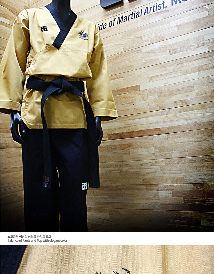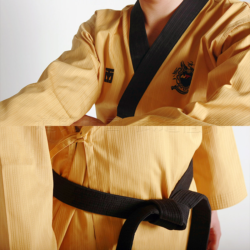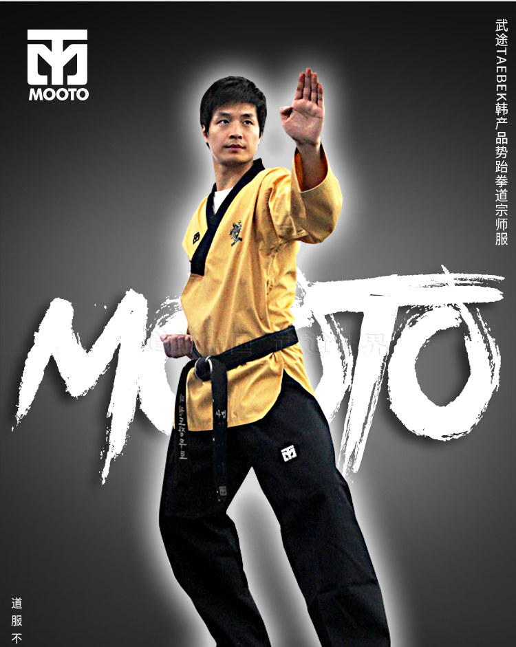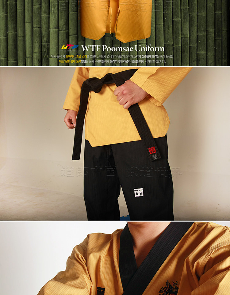 Mooto Wtf Taebek Pomsae High Dan ormiforms, Mooto Black Belt Special Special Doctrine, конкурс в стиле Taekwondo.Ярко -желтый топ, глубокие голубые брюки (близко к черному), черный воротник пластинки, подходящие для учителей и стипендий на высоком уровне.