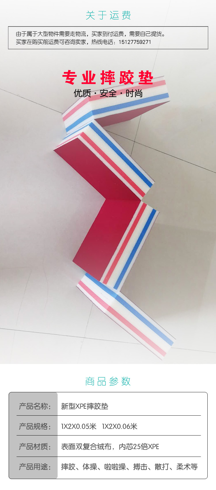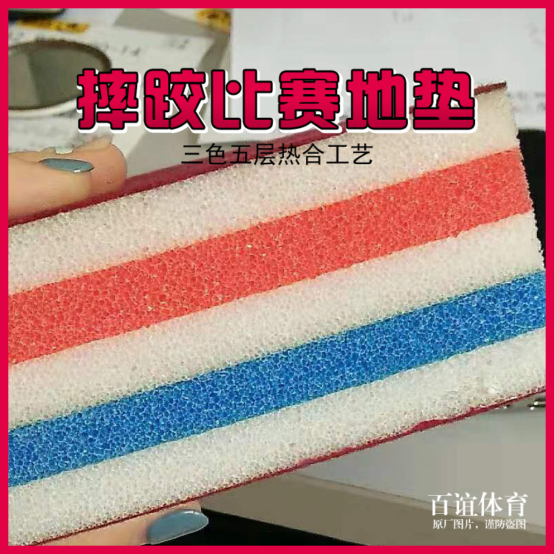 Технические характеристики материала подушкой борьбы: в 25 раз, XPE, три -колор и пять слоев теплового процесса -белый, белый, белый, синий и белый, каждая толщина слоя составляет 1,0 см, размер единого блока равен 2 м.×1m×0,05 м, весь набор из 72 блоков.Обе стороны композитной бархатной ткани, бархатный слой использует горячую и горячую композитную технологию с внутренним композитом поверхностного слоя.