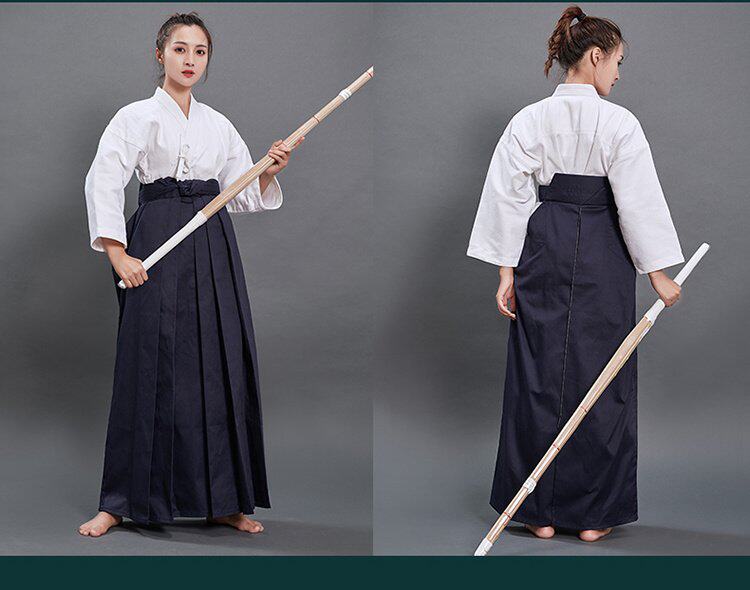 - Белый костюм с белым верхом и темно-синим + бамбуковый меч.