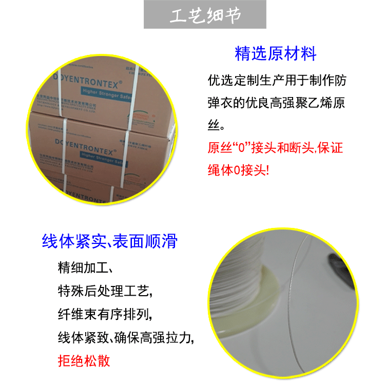 Полиэтиленовое волокно с высокой силой (также известным как сверхвысоко -высокий молекулярный квантотический полиэтилен, волокно UHMWPE и т. Д.), Который также известен как три высокопроизводительных волокна в мире. Оно примерно на 50%выше, что является общим. Сырье для пуленепродажных и режущих перчаток.