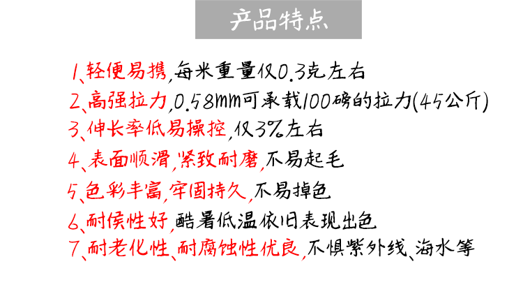 “ yora/you nai” серия воздушных змеевпродукт,Используйте высокопоставленное полиэтиленовое волокноUHMWPEДля сырья используйте разумный процесс ткачества, чтобы дать полную игру для превосходной производительности волокна; в то же время используйте импортированные защитные покрытия для дальнейшего проходаПредварительныйРастяжение, покрытие, сушка, гладкая поверхностьДождитесь процесса обработки, чтобы обработать процесс,Корпус проволоки плотный и гибкий, долговечный и устойчивый и износ и длительный цвет,Это именно из -за многоканального процесса обработки и использования индивидуального превосходного сырья, которые обеспечивают нашу серию продуктов полета на полиэтиленовых змеях с отличной производительностью и долговечностью. Это ваш гарантированный выбор для вас, чтобы вылететь все виды воздушных змеев на открытом воздухе. !