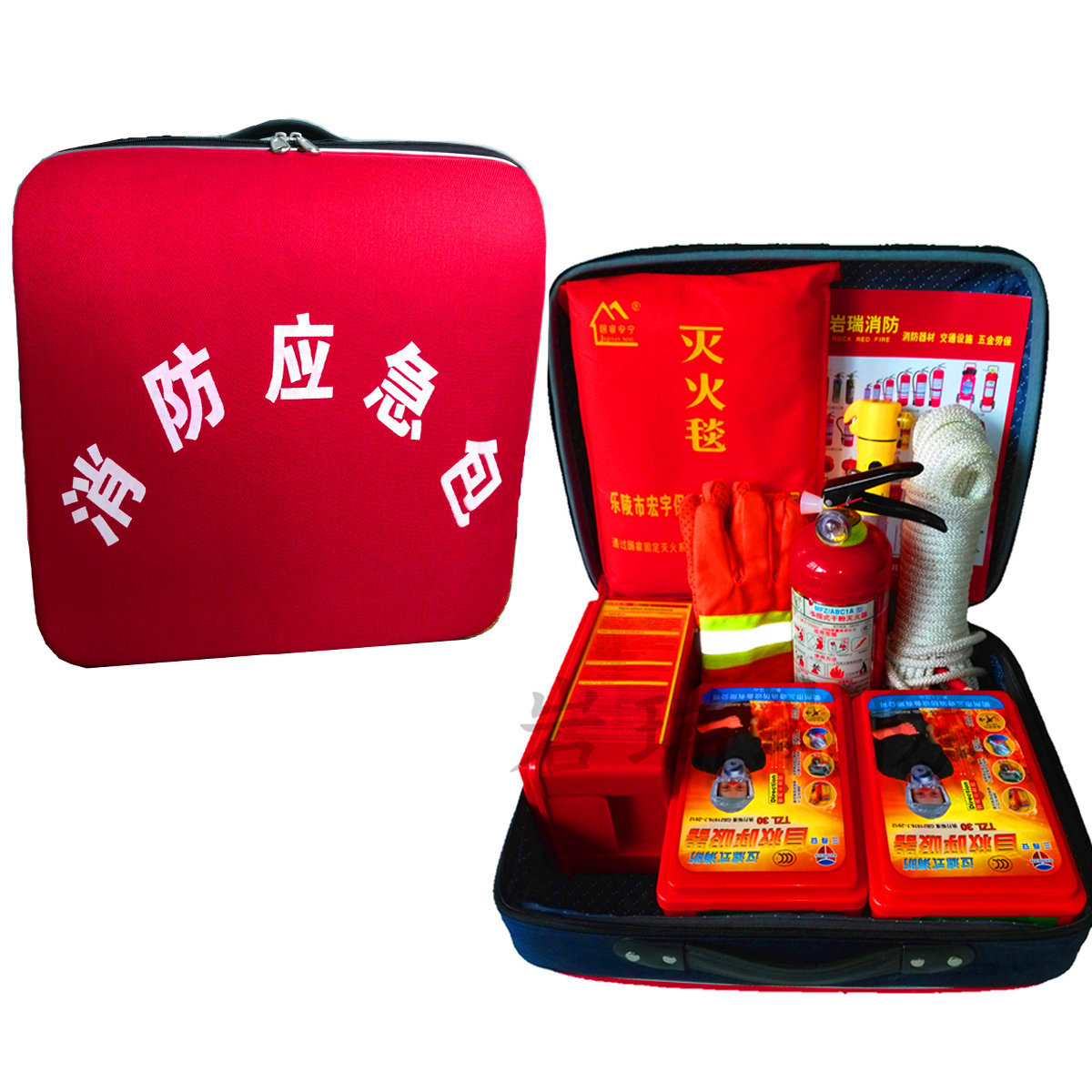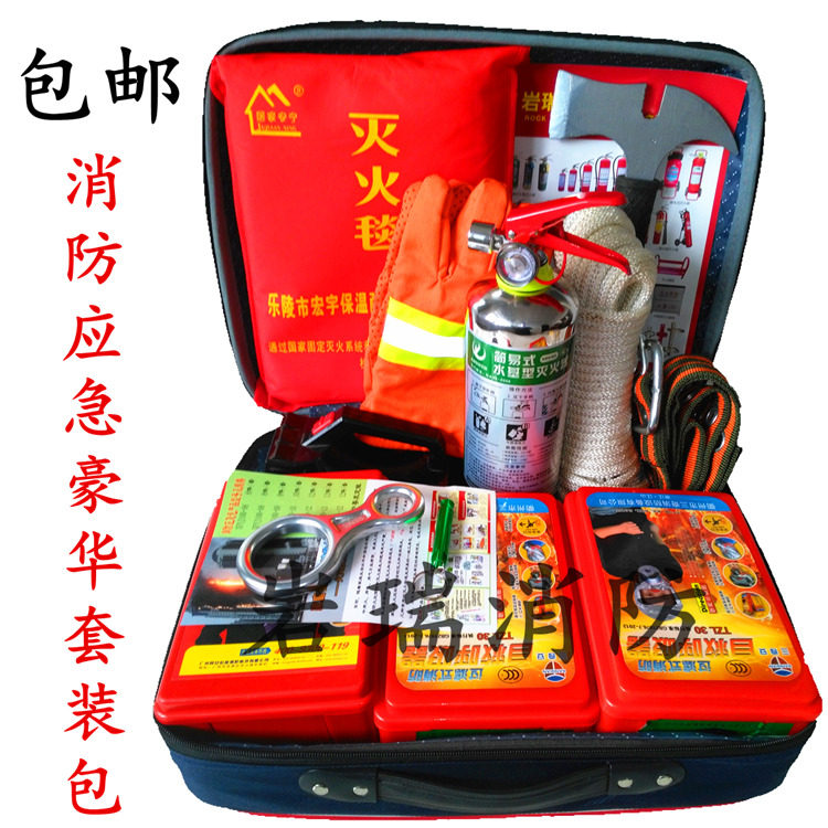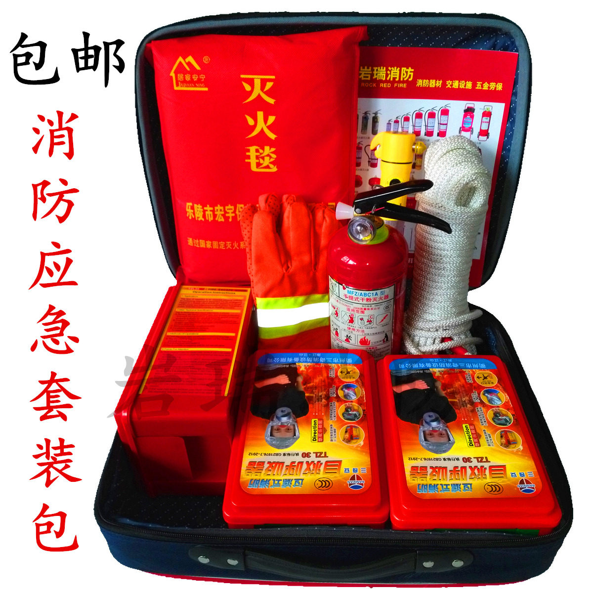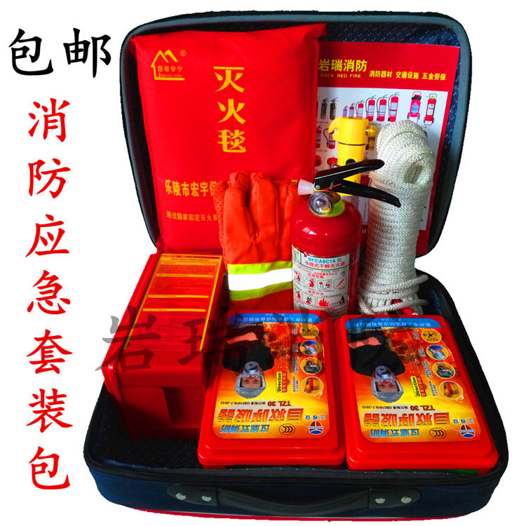 [消防应急八件套装][:][一个应急包、一个防毒面具、一个干粉灭火器、一个]1[㎡灭火毯,一副普通防滑手套 一个多功能手电筒,一根20米普通安全绳,一个小口哨、赠][一个消防湿毛巾][,一份使用说明书].