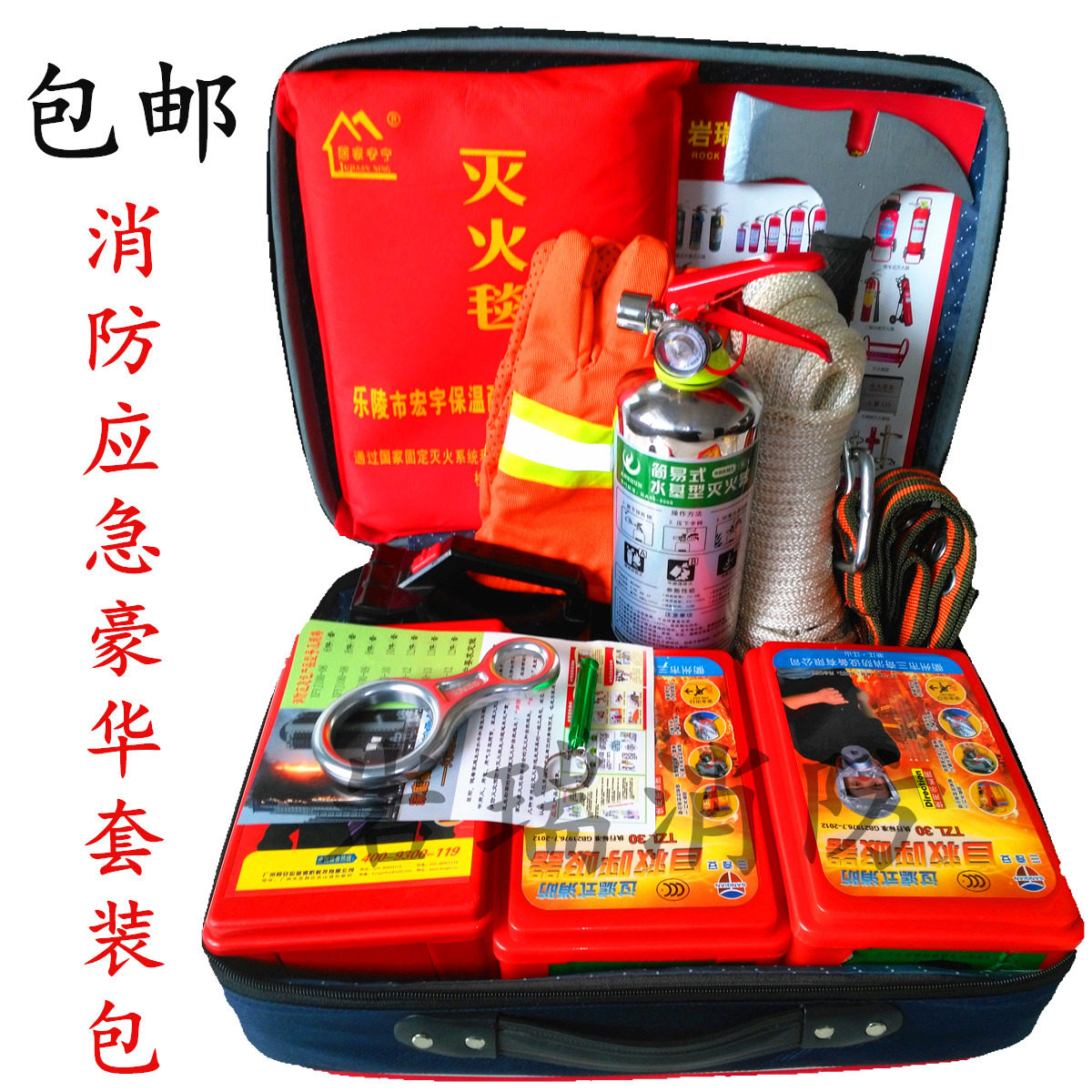 [三口之家豪华套装][:][一个大应急包、三个防毒面具、一个不锈钢水基灭火器、一个]1.5[㎡灭火毯,一个耐高温手套,一个强力手电筒,一根][带钢丝阻燃20米安全绳,][一套腰带/一个腰斧/一个八字环缓解器/一个铝合金小口哨/三个消防湿毛巾,一份使用说明书][共14件火灾应急逃生用品.]
