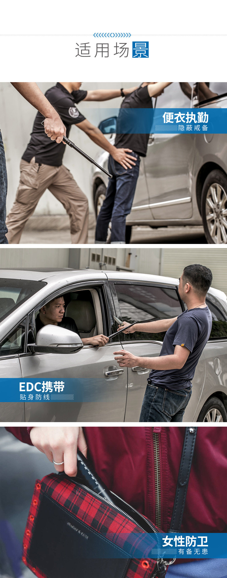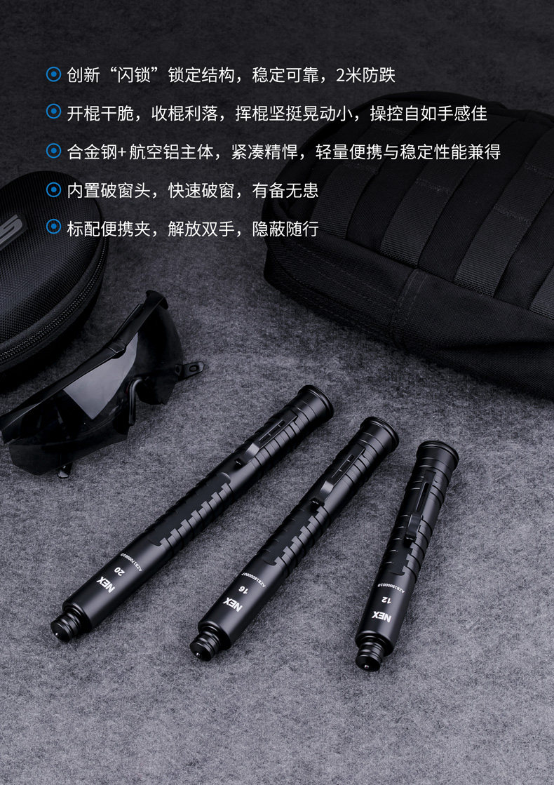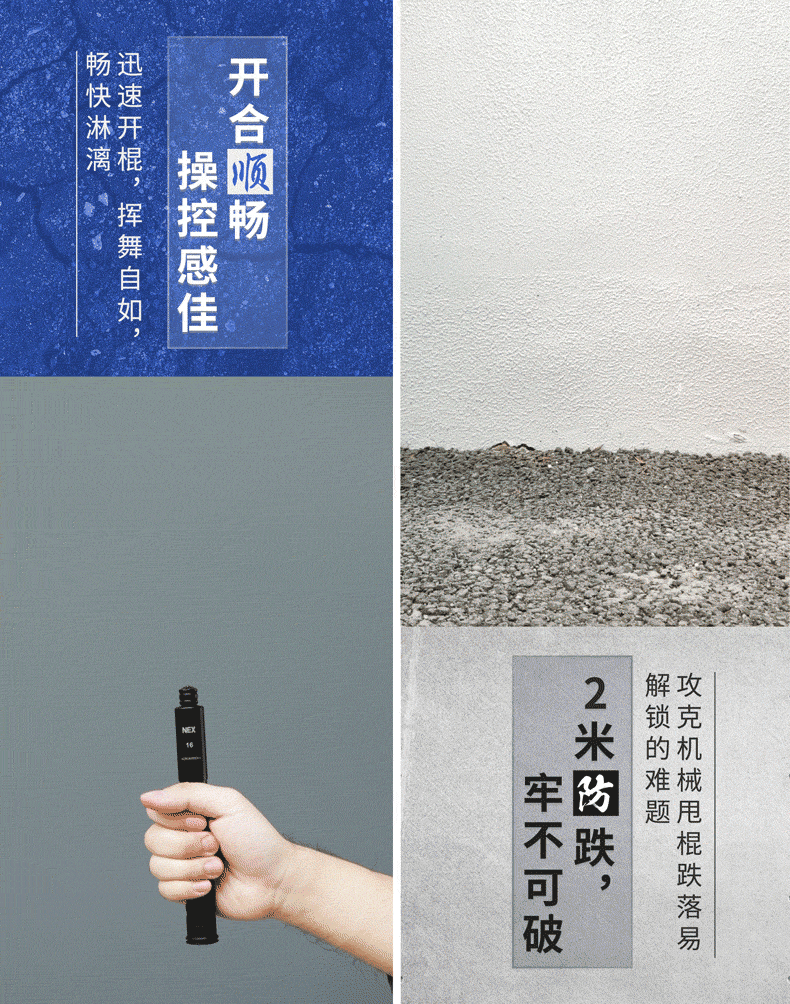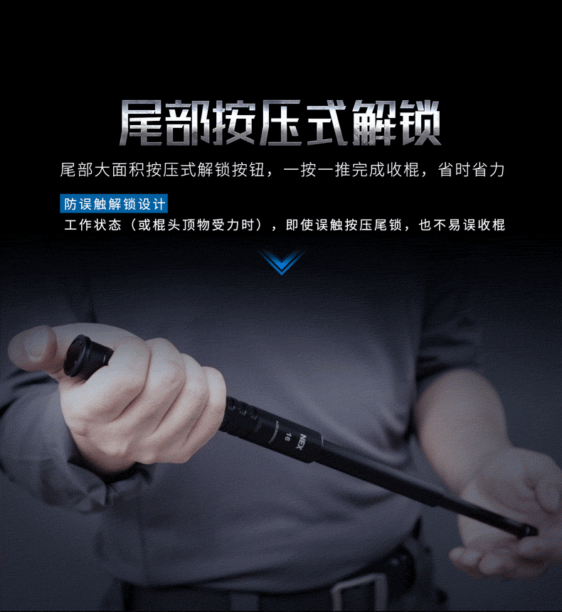Анти-случайная сенсорная разблокировка.Конструкция: в рабочем состоянии (или когда на верхнюю часть палки приложена сила), даже если хвостовой замок случайно нажат, закрыть палку по ошибке нелегко.