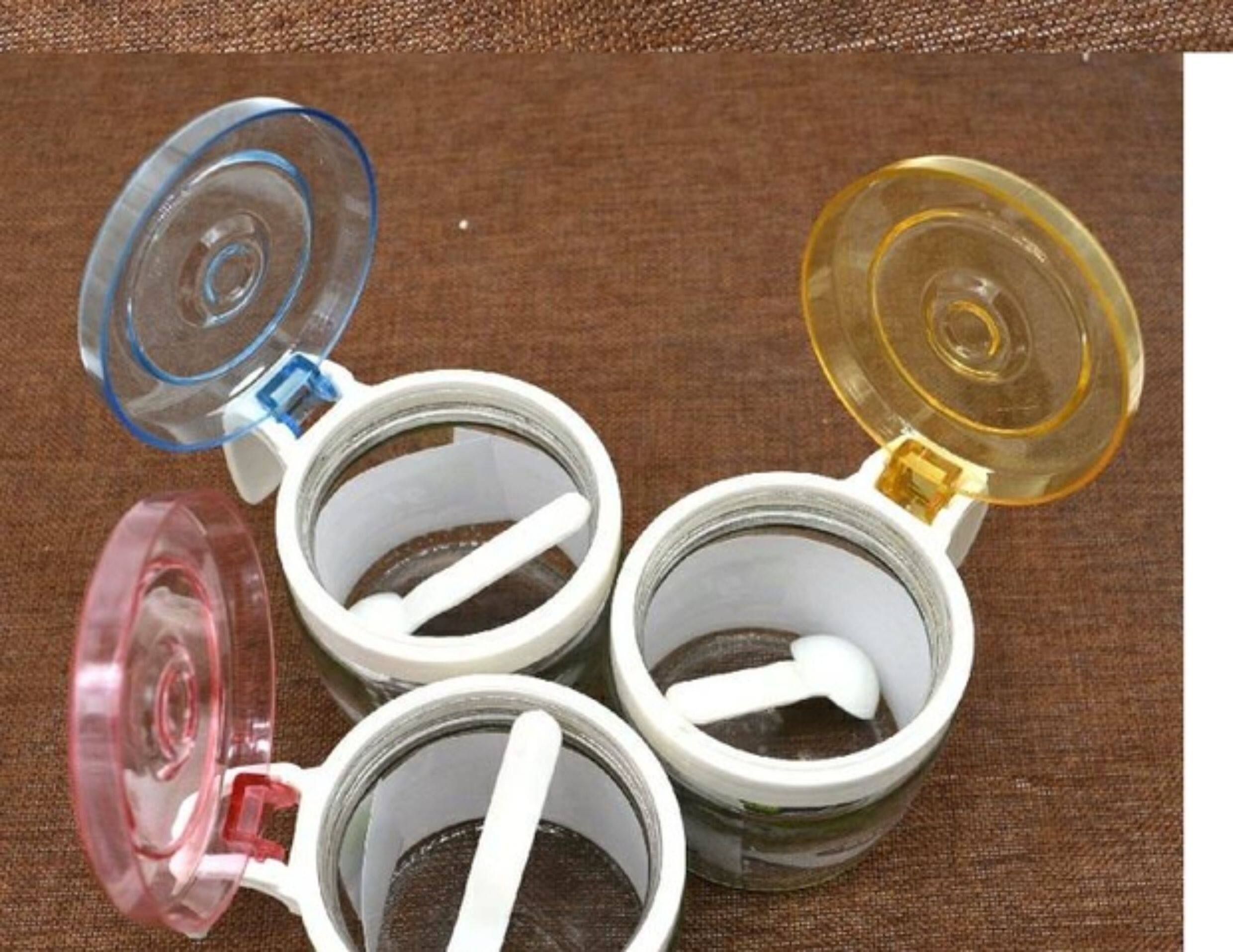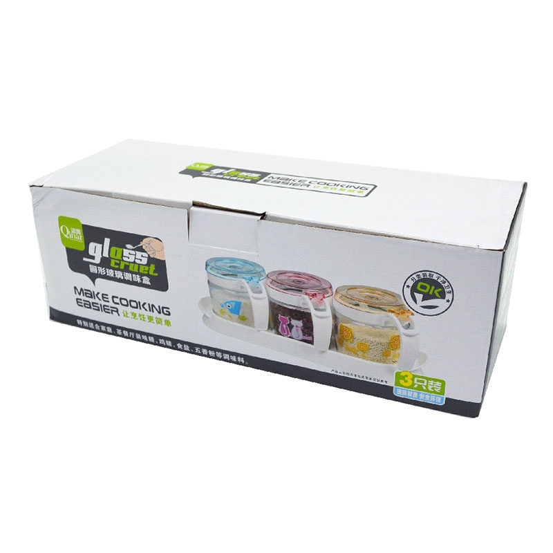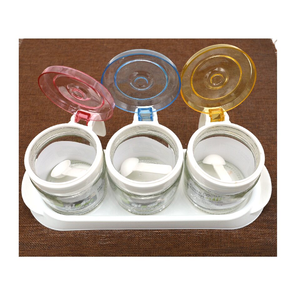 3 пачки стеклянной приправы, круглая кухонная коробка приправа, соленая банка, приправа бутылочки с ложкой банки приправы