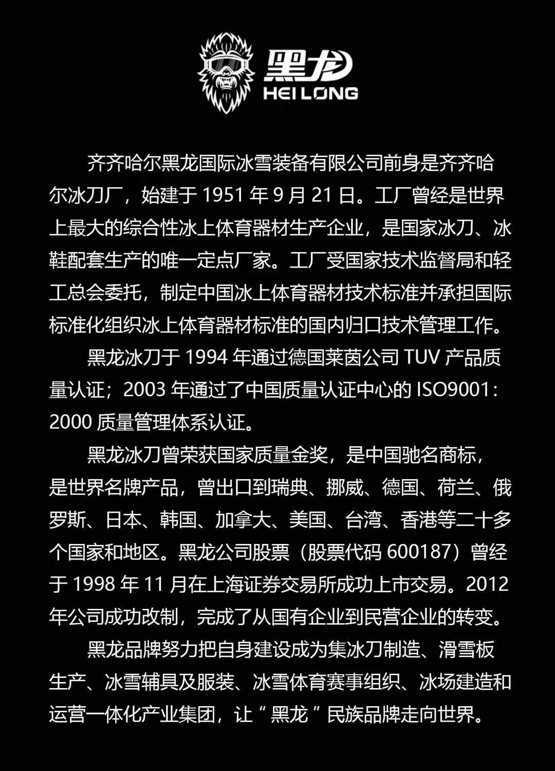 Бренд Black Dragon, National Glory.Ледяной нож Black Dragon прошел сертификацию качества немецкой компании RHEIN TUV в 1994 году;Он выиграл национальную качественную золотую награду и является известной торговой маркой в Китае. Япония, Южная Корея, Канада, Соединенные Штаты, Тайвань и Гонконг.