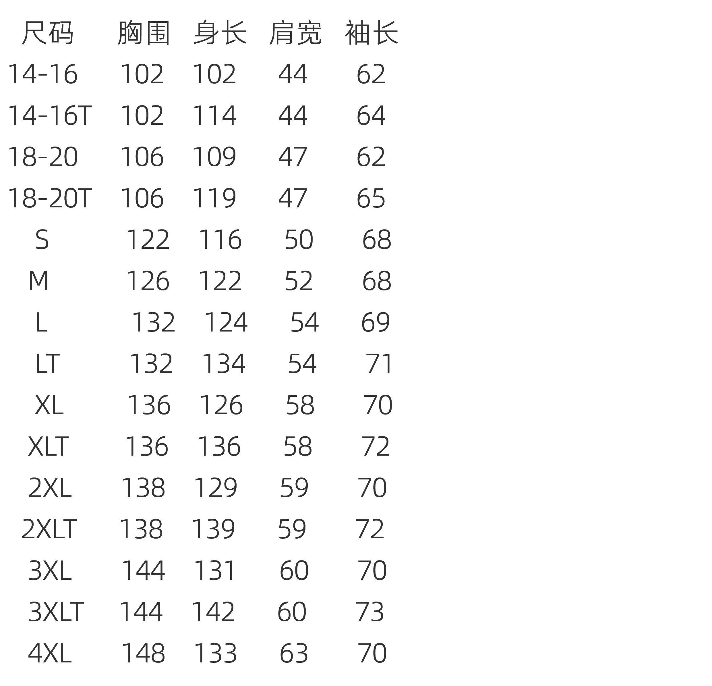 | Характеристики продукта: | 14-16, 14-16T, 18-20, 18-20T, S, M, L, LT, XL, XLT, 2XL, 2XLT, 3XL, 3XLT, 4XL |