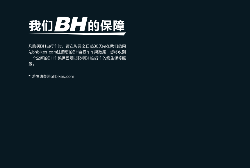 Примечание. При покупке велосипедов BH, пожалуйста, будьте в нашей сети в течение 30 дней с даты покупкиСтанция BHBIKES.com Зарегистрируйте данные о велосипеде BH, вы получите егоНовый номер сохранения кадров BH получен для служб пожизненной гарантии для велосипедов BH.