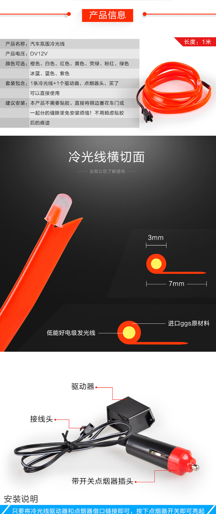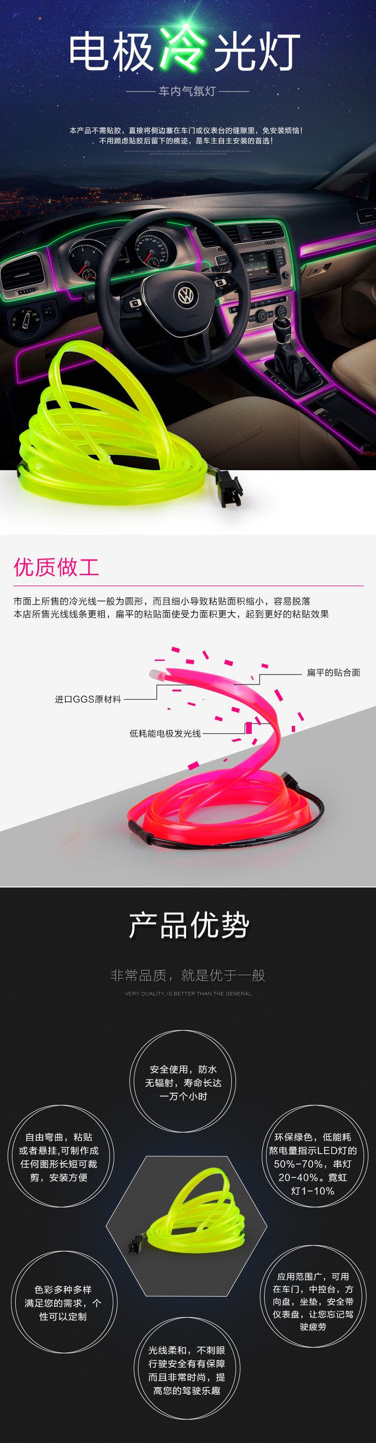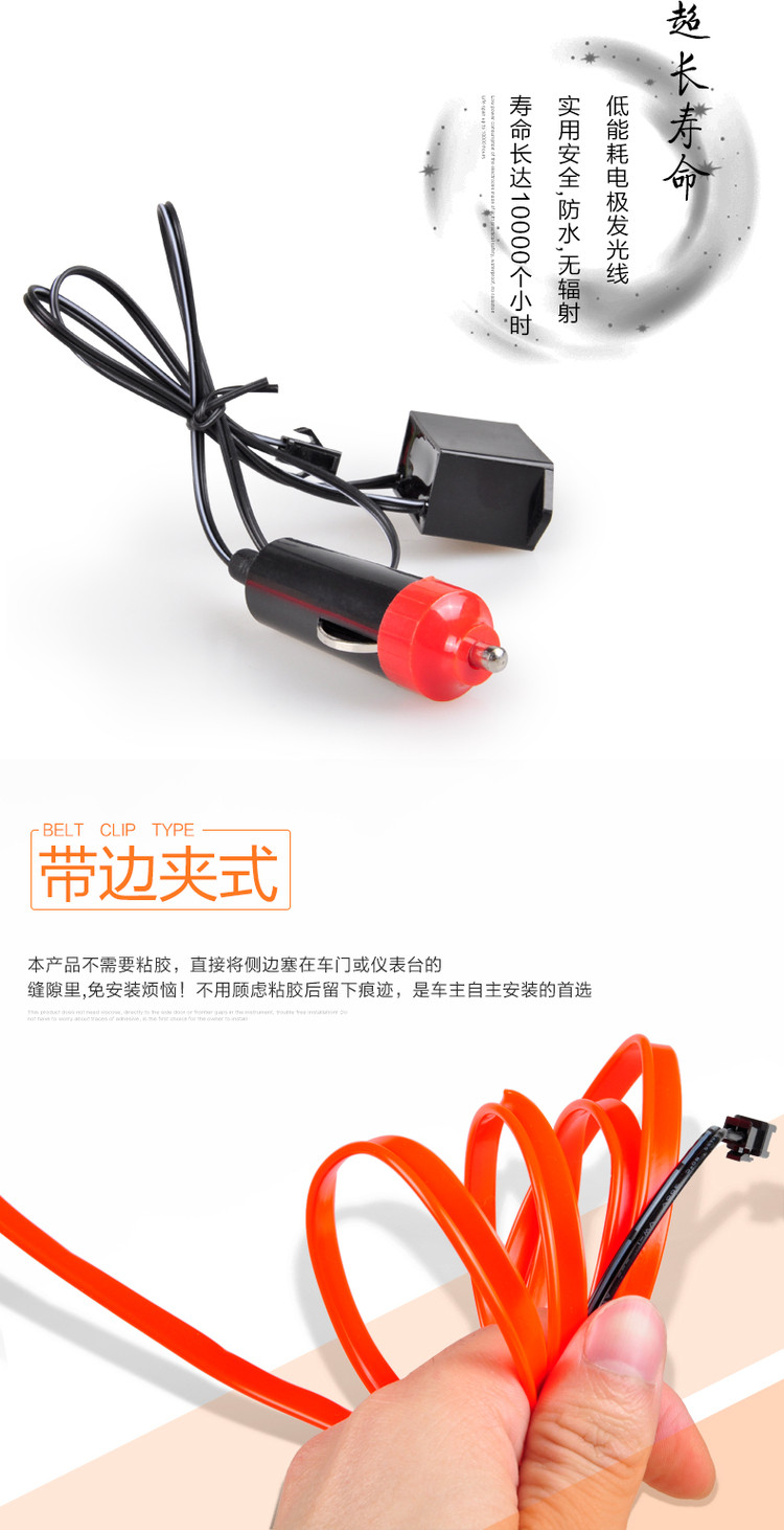 Диаметр светящегося стержня составляет 2,3 мм, с 6 -миллиметровыми краями для шитья, а установка более удобна (центральная консоль может напрямую подключить сторону к зазору, не нужно приклеить клей)