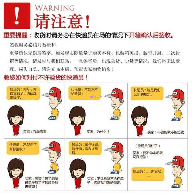 1. Перед подписанием ребенка друзья должны открыть коробку, чтобы проверить товар и обнаружить, что проблема ущерба должна быть непосредственно отказаться для подписи и вернуть его на первоначальную дорогу курьерской компании. В то же время мы должны уведомить нам, что мы пополним вас вовремя.Если вы не проверяете товар, вы подписали какие -либо убытки, вызванные покупателями.
