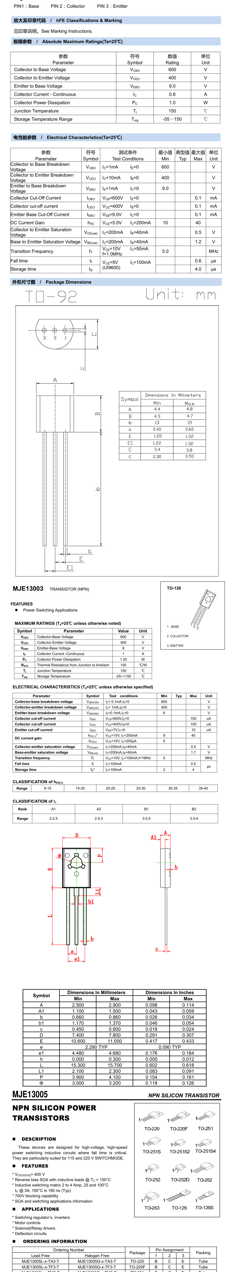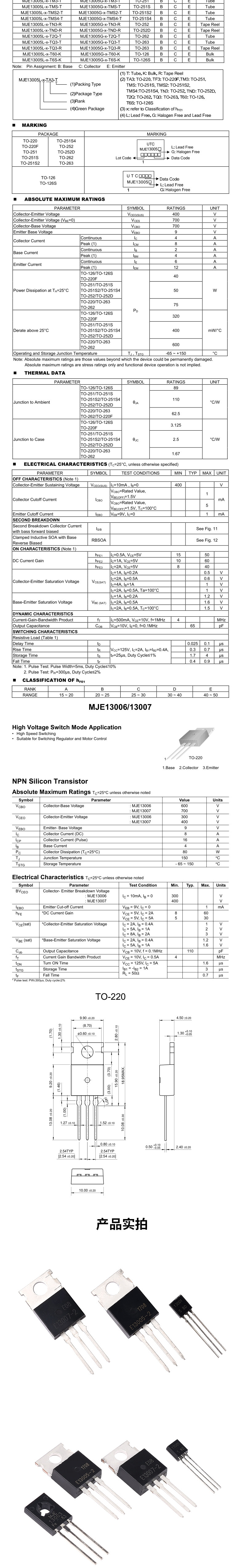 MJE13001/13003/13005A/13007 Триод Прямая упаковка переключения питания до-92/220