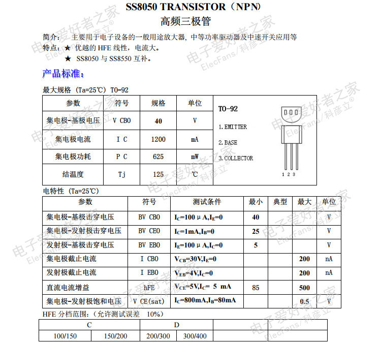 (50) Прямая вставка SS8050 NPN Большой ток 1,5 А 40 В обычно используется малая мощность транзистора транзистора
