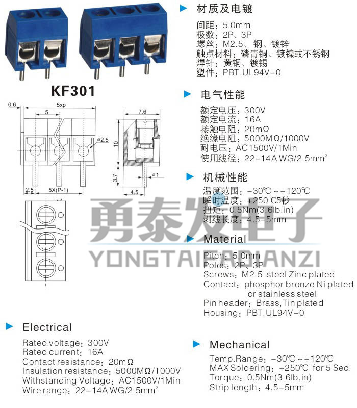 Проводная проводная терминал терминал-2P/3P KF301-2P/3P-битный проводной клемма 5.0-301-2P/3P