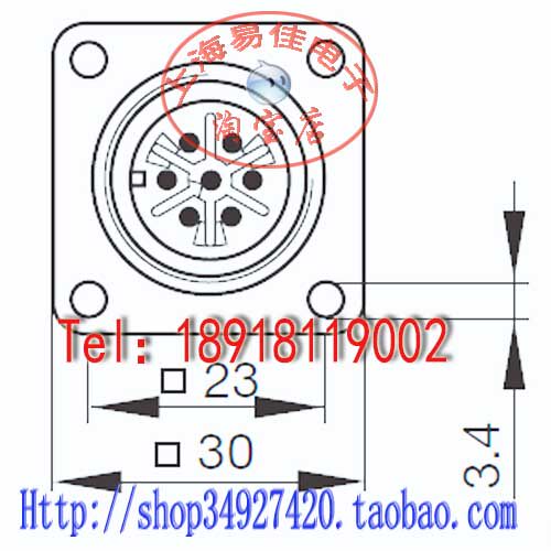 Розетка 7-контактная, фиксируется четырьмя винтовыми проушинами, расстояние между ними 23*23 мм. Сторона * сторона = 30*30 мм, внешний диаметр резьбы около 22,2 мм, тип сварки стержня.