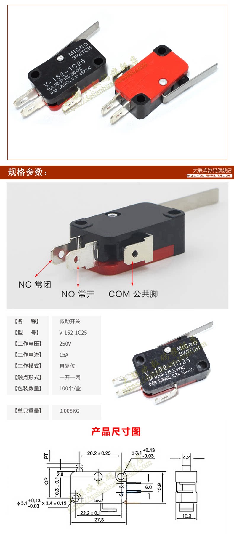 V-152-1C25 Micro Switch-переключатель удара с ручкой серебряной контакты.