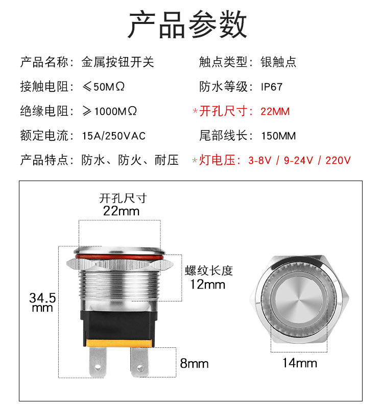 Переключатель, кнопка, светодиодная лента, индикаторная лампа, 22мм, 6v, 12v, 24v, 220v