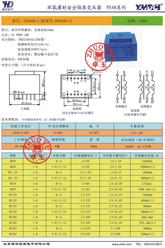 Yao Hua Dechang YHDC 12W/12VA трансформатор эпоксидного уплотнения PE4820D-I