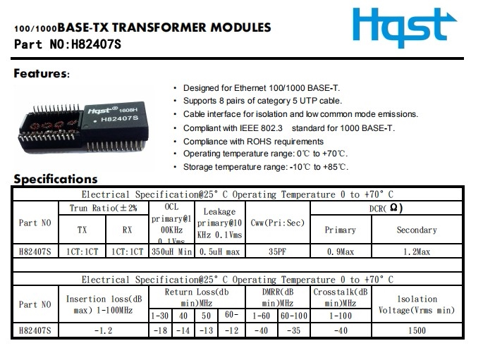- Тип трансформатора:LAN 10/100/1000Base-T
