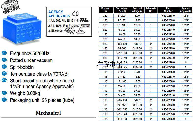 EI30/12,5 1,5VA трансформатор эпоксидного уплотнения 230 В/12 В 1,5 ВА BV030-7139.0