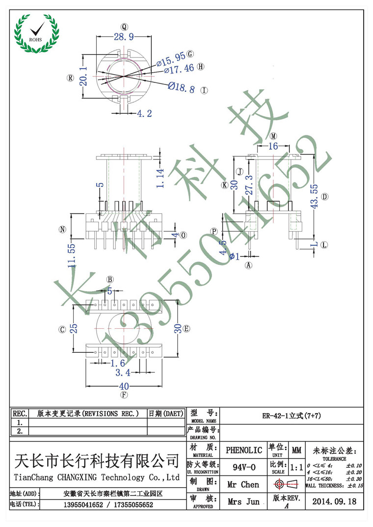 EC/ER42-1 Вертикальный 7+7 Высокочастотный скелет трансформатор. Физическая компания.
