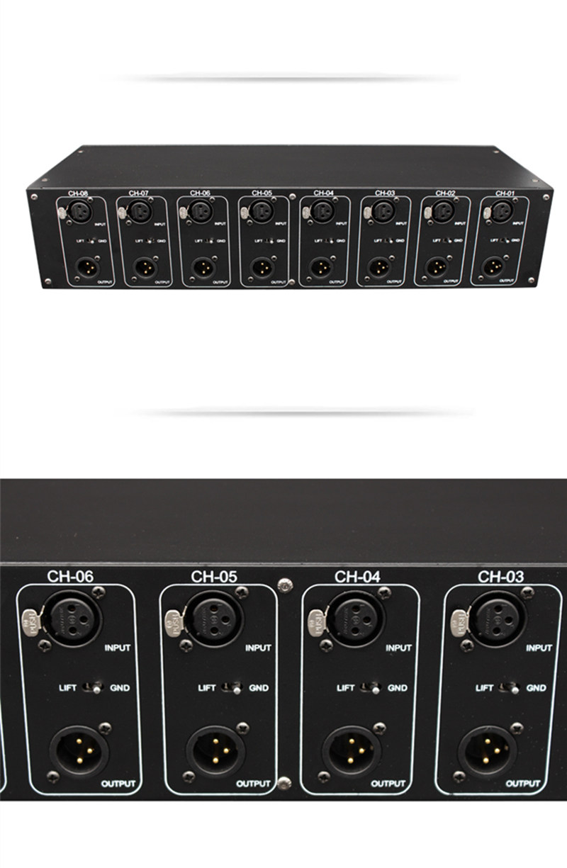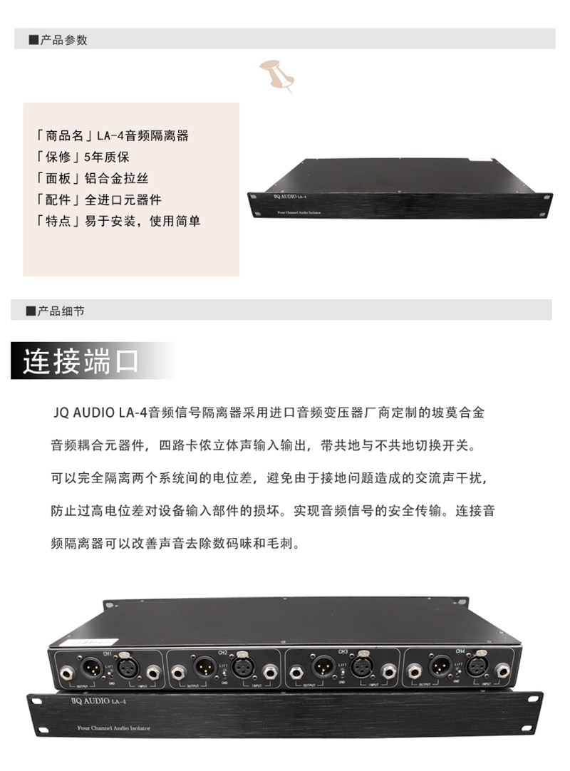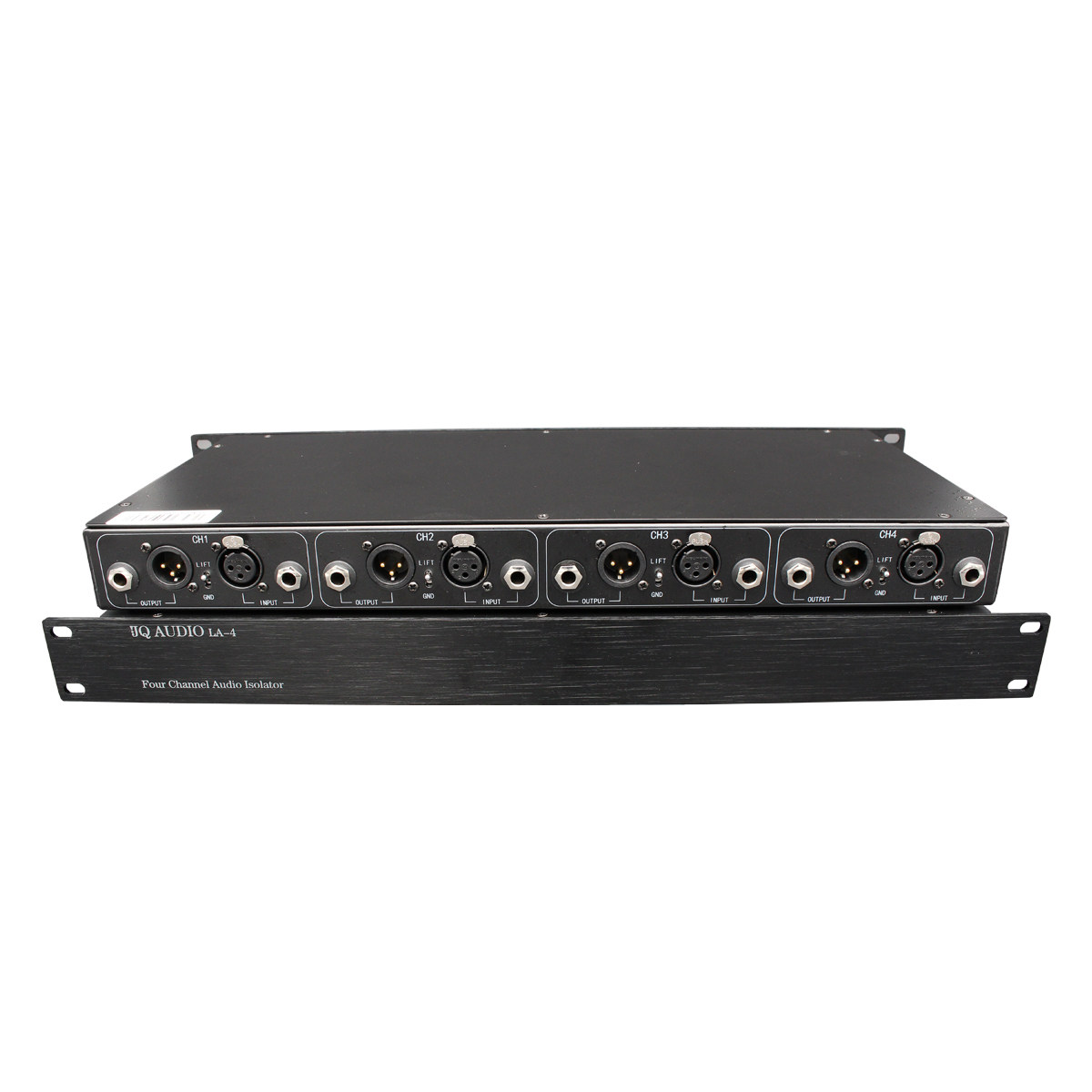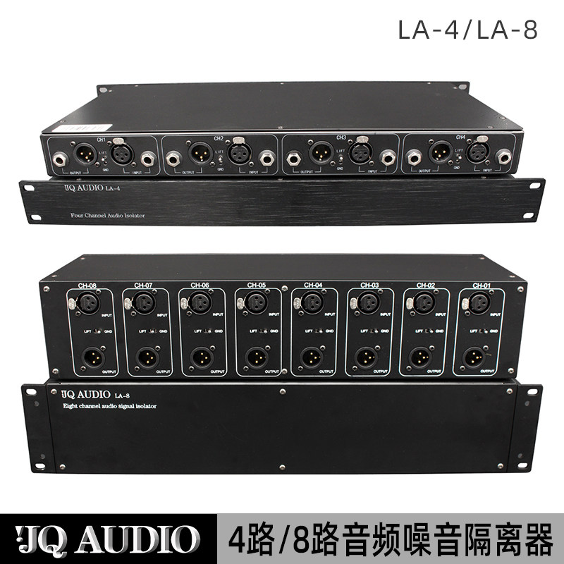 JQ AUDIO LA-4, изолятор аудиосистемы с 4 входами и 4 выходами, подходит для изоляции передачи аудиосигналов между системами в аудиосистемах, устранения шума, изоляции текущего звука, устранения шума, создаваемого передачей на большие расстояния, и защиты оборудования.Стандартное шасси высотой 1U, корпус из высококачественного матового алюминия, простота установки.