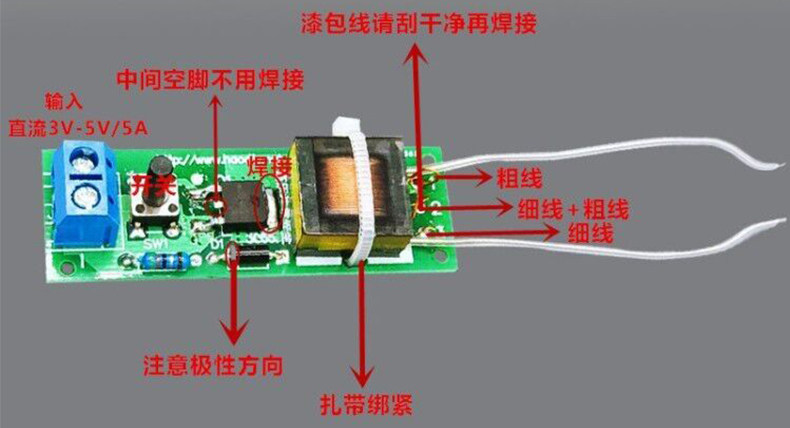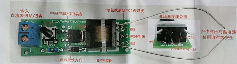 ПРИМЕЧАНИЕ. Этот набор генератора зажигания дуги (не припаянный) генерирует короткие дуги с помощью питания 3-5 В.