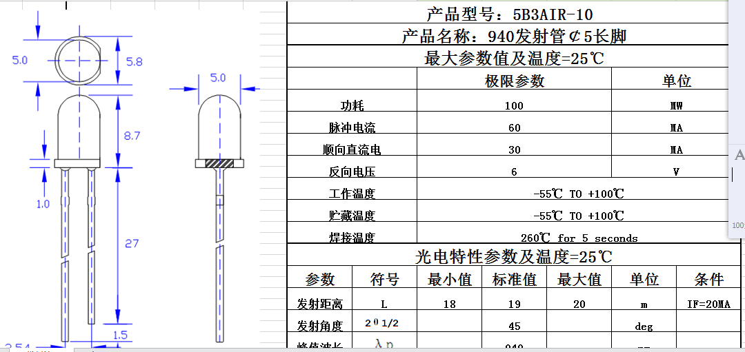 5 мм940 Инфракрасная трансмиссионная трубка Мониторинг передаваемой пробирной трубки F5 Инфракрасная пробирная трубка 940 Импорт длины волны большой чип