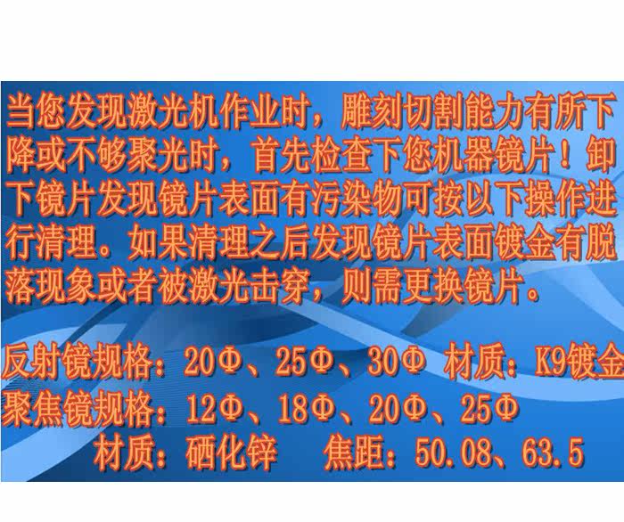 В импортном материале фокусирующих линз из селенида цинка, производимом нашей компанией, используются лучшие импортные подложки из-за границы, с высоким коэффициентом пропускания света и усовершенствованным процессом нанесения покрытия. Он прочный и его нелегко отклеить. Он имеет точную точку фокусировки и хорошие эффекты резки и гравировки.
