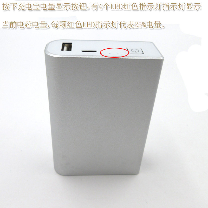 1, нажмите кнопку отображения питания банка питания,4индивидуальныйLEDКрасный индикаторный свет показывает текущую батарею, каждый красныйLEDИндикаторные огни представляют собой25%Электричество.