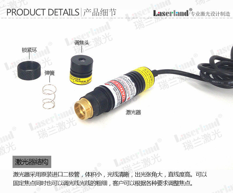 Встроенный встроенный лазерный диодный чип 520 нм, импортируемый из Osram, который характеризуется низкой температурой и высокой доступной температурой и может работать стабильно без предварительного нагрева при низких температурах.Может использоваться при температуре 40 градусов и минус 10 градусов для непосредственного излучения света,Производимый свет мягкий и не ослепительный, и это травяной зеленый цвет. Он имеет импортные стеклянные оптические линзы, которые хороши, гладкие и без заусенцев.Этот продукт более подходит для маркировки и позиционирования.