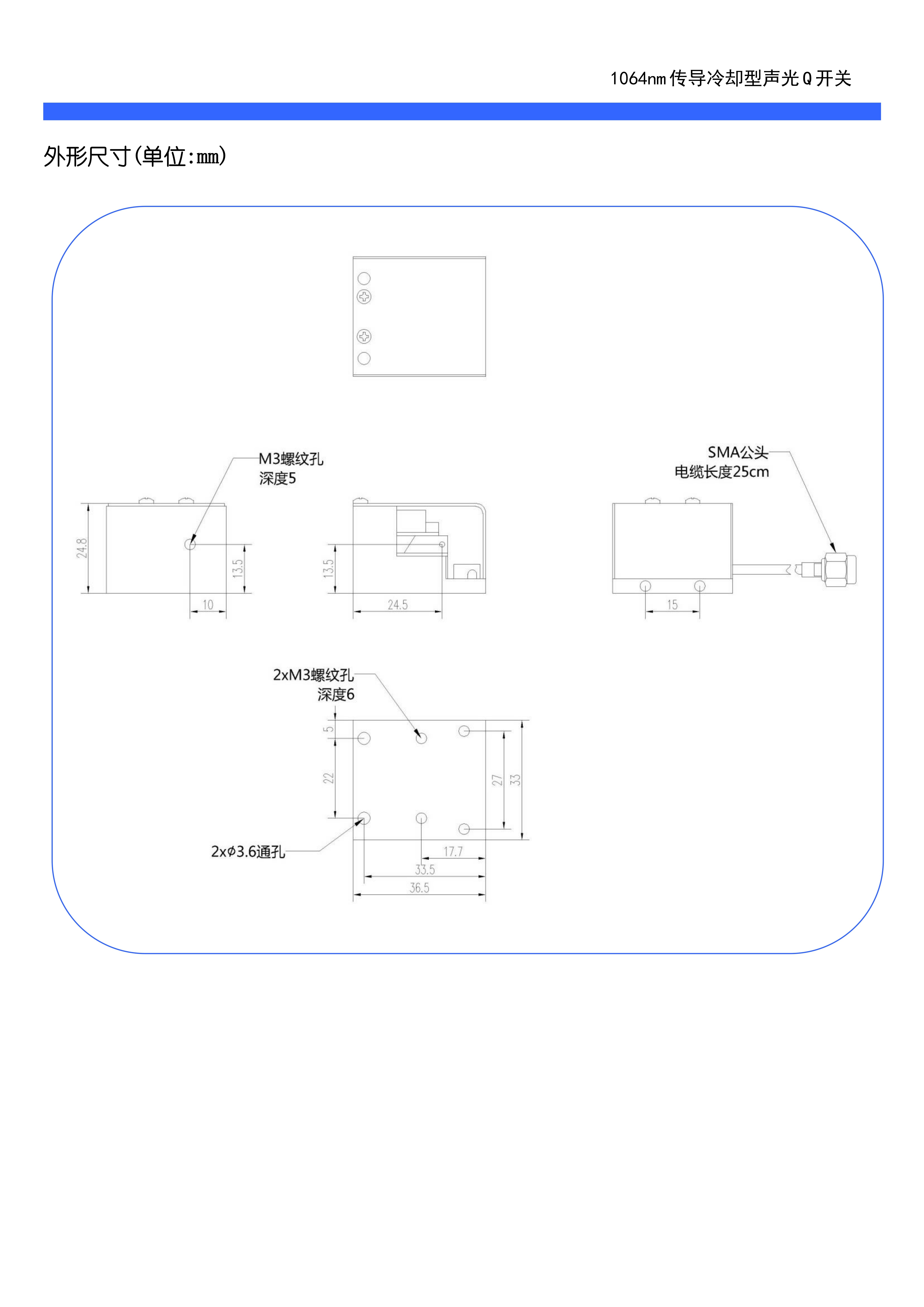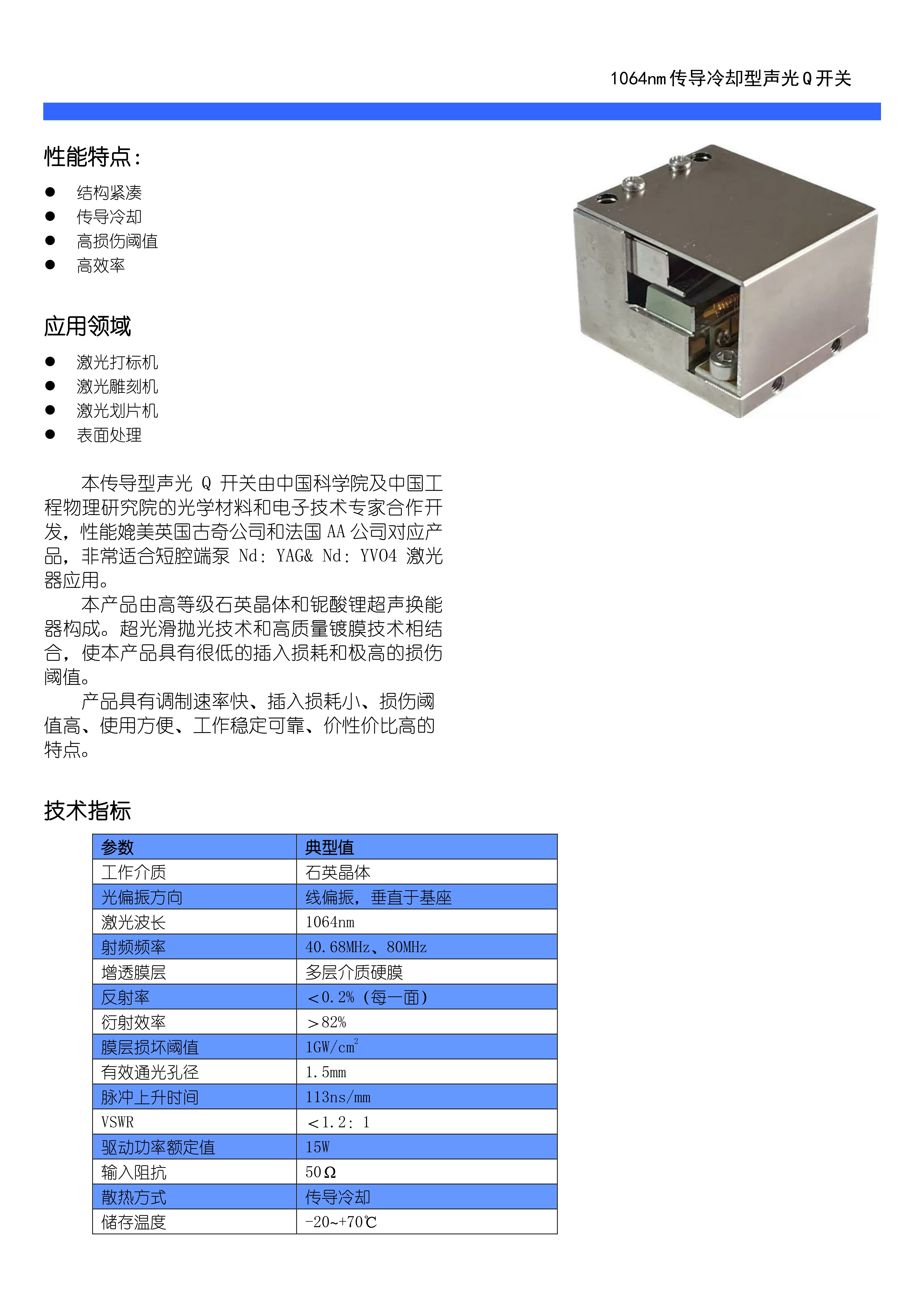 Акустооптический переключатель добротности с кондуктивным охлаждением, 41 МГц \ 80 МГц, 1064 нм \ лазер с торцевой накачкой \ УФ-лазер