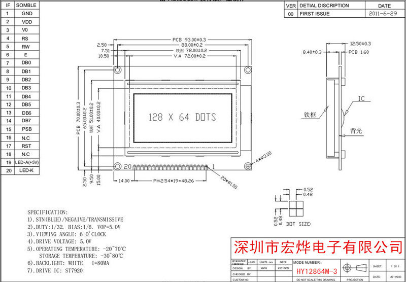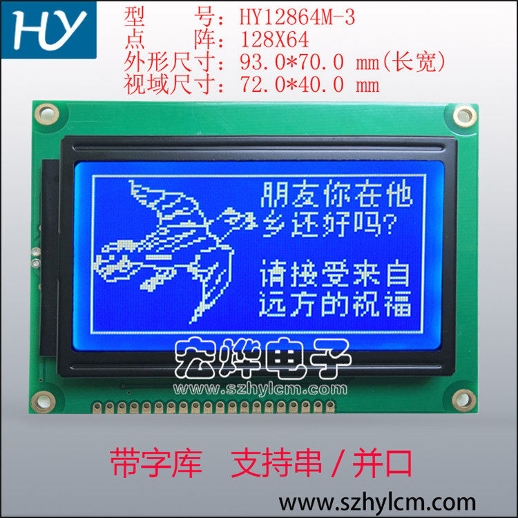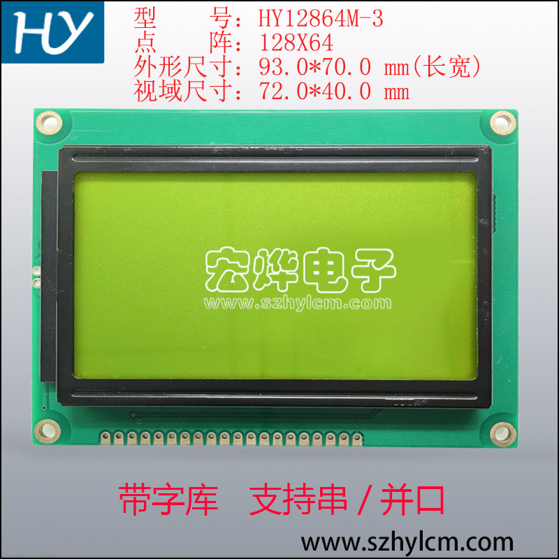 · HY12864M-3[中文字库型液晶显示模块可以显示字母、数字、中文字型及图形,具有绘图及文字画面混合显示功能。可显示128(列)]× [64(行)点阵。可完成图形显示,也可显示8]×[4个(16]×[16点阵)中文汉字。] · [提供三种控制接口:] [8位微处理器接口、4位微处理器接口、串行接口。] · [模块内置2M-位元中文字型ROM] (CGROM) [总共提供8192] [个中文字型(16]×[16点阵),16K-位元半宽字型ROM] (HCGROM) [总共提供126] [个符号字型(16]×[8点阵),64]×[16-位元显示RAM] [(DDRAM),另外绘图显示画面提供一个64]×[256点的绘图区域(GDRAM),可以和文字画面混和显示。] · [提供多功能指令:画面清除(Display] [clear)、光标归位(Return] [home)、显示打开/关闭(Display] [on/off)、光标显示/隐藏(Cursor] [on/off)、显示字符闪烁(Display] character [blink)、光标移位(Cursor] [shift)、显示移位(Display] [shift)、垂直画面卷动(Vertical] line [scroll)、反白显示(reverse] [display)。] [公司生产样貌:]