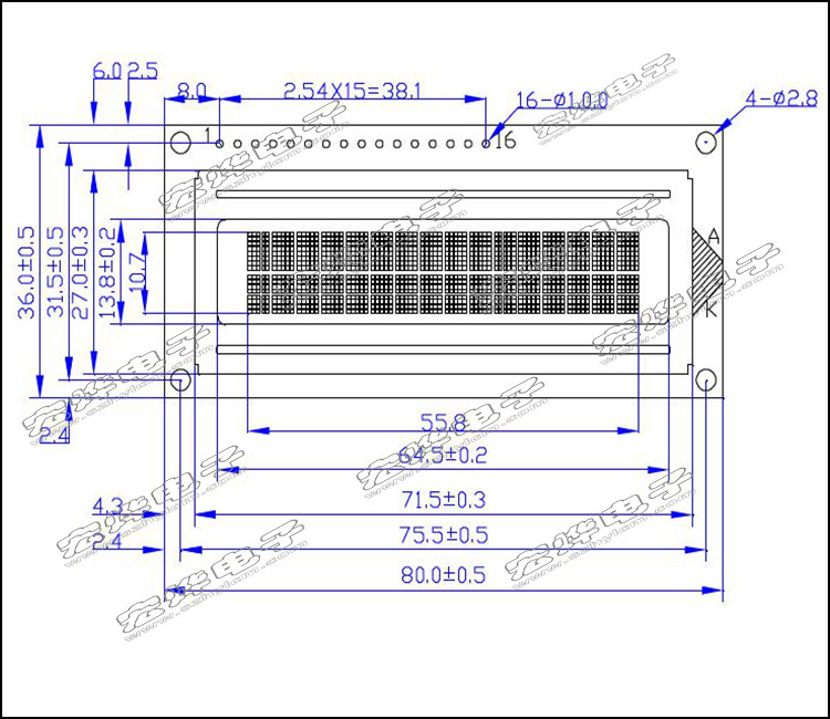 Содержимое дисплея состоит из 2 строк, каждая строка отображает 16 символов, а размер каждого символа составляет 5.×8 часов.