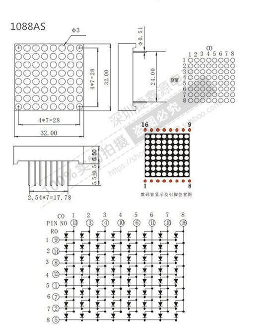 3 мм 8*8 Светодиодный модуль капитала 1088bs вместе Yang 1088AS Gongyin High Braign Red 16 32*32 мм