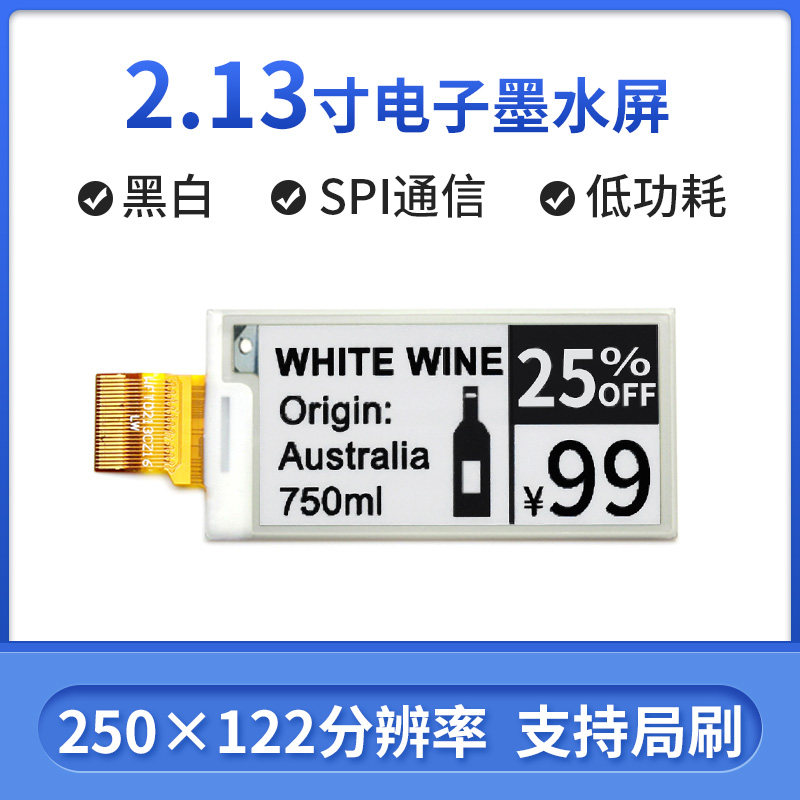 Я - обнаженный экран экрана электронных чернил, 2,13 дюйма, разрешение 250x122, с внутренним контроллером с использованием связи интерфейса SPI для поддержки локального обновления.