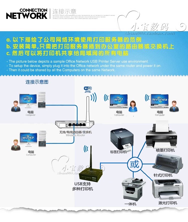 | «Преимущества» беспроводное соединение, легко реализовать беспроводную печать, сохранить неприятности подключения и положить одно место в принтер; &Nbsp; нет программного обеспечения, печати напрямую, мультиперсон использует автоматические очереди поддержки одновременно;   простые настройки, все китайские страницы, локальные сетевые компьютеры могут делиться принтерами;   поддерживает использование сегмента сегмента перекрестия и делится принтером в нескольких сегментах сетевых сегментов, которые могут быть отделены от внутренних и внешних сетей. |