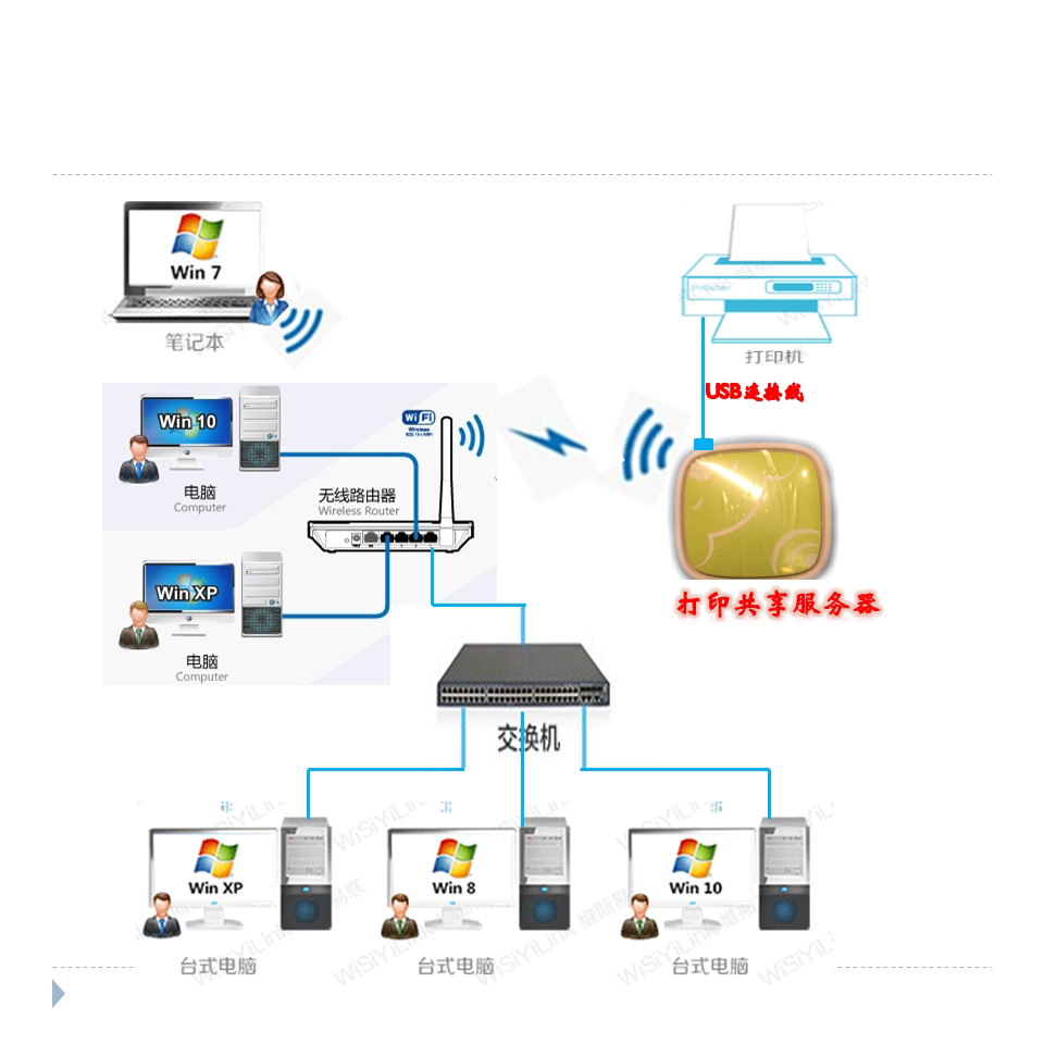 Один или несколько интерфейсов USB в каждом устройстве может подключить один или несколько USB -принтеров, а компьютеры в одной и той же локальной сети могут быть напечатаны.