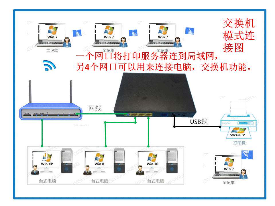 1. Поставляется с 5 -портовыми функциями коммутатора, один из 4 сетевых кабелей, скорость печати очень быстрая, а другие типы печатных серверов на втором рынке.