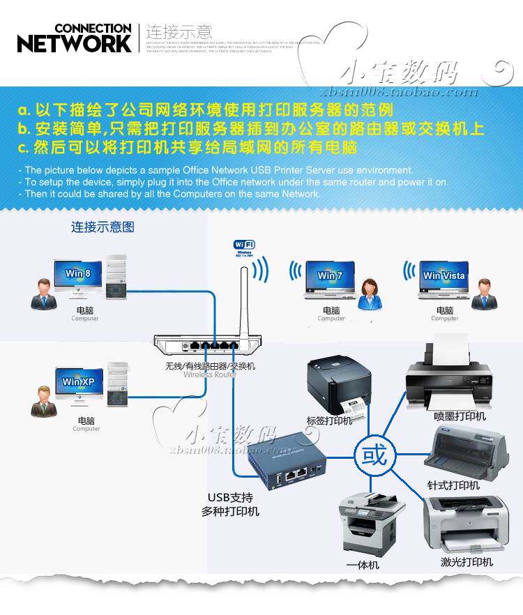 | "преимущество"Без программного обеспечения, печати напрямую, Multi -Pperson использует автоматические линии поддержки одновременно;   простые настройки, все китайские страницы, локальные сетевые компьютеры могут делиться принтерами;   поддержка использует сегмент сегмента перекрестия и делится двумя принтерами в нескольких сегментах сети, которые могут блокировать порты внутри и снаружи. |