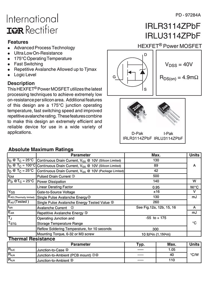 Оригинальный подлинный irlr3114ztrpbf to-252-3 n-канал 40V/130a Mosfet