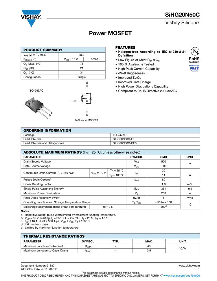 Оригинальный подлинный SIHG20N50C-E3 TO-247 N TUNAN 560V20A Прямая вставка