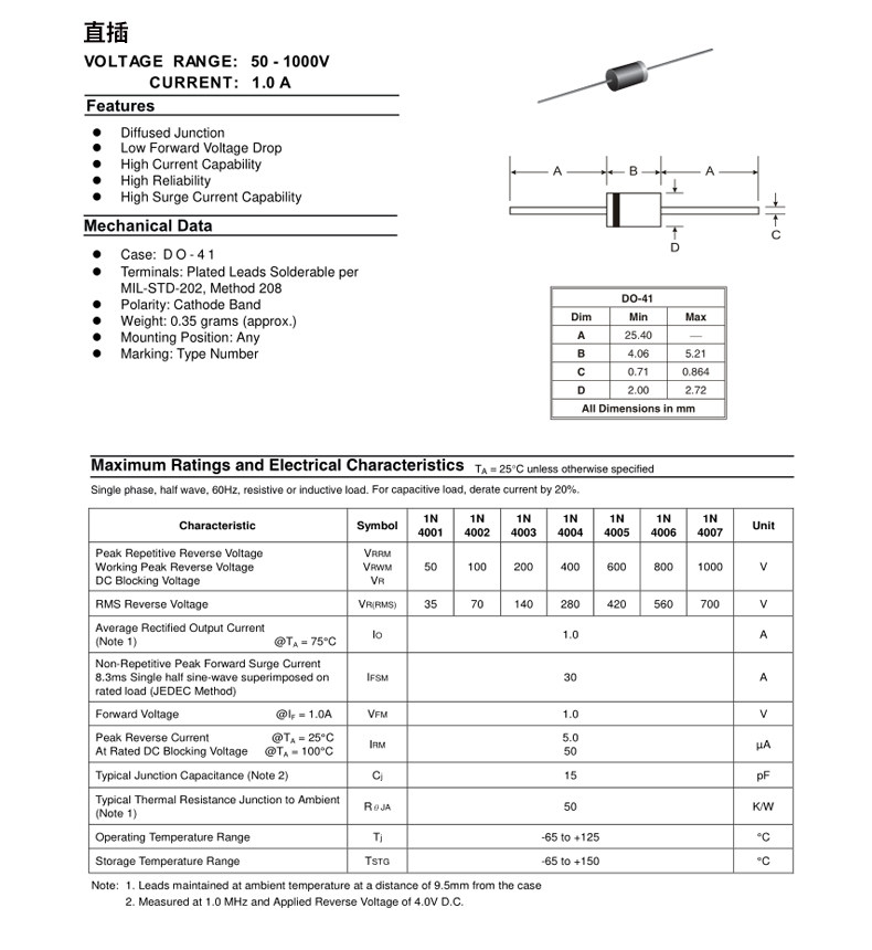 - 1N4001 Прямая вставка (50)