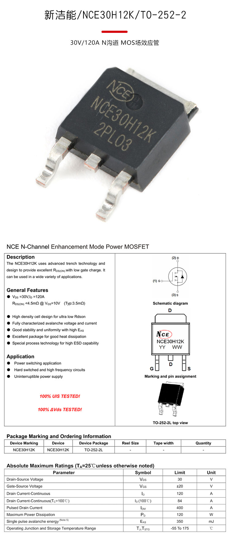 Оригинальный подлинный NCE30H12K до 252-2 30 В/120A N Канал МОС