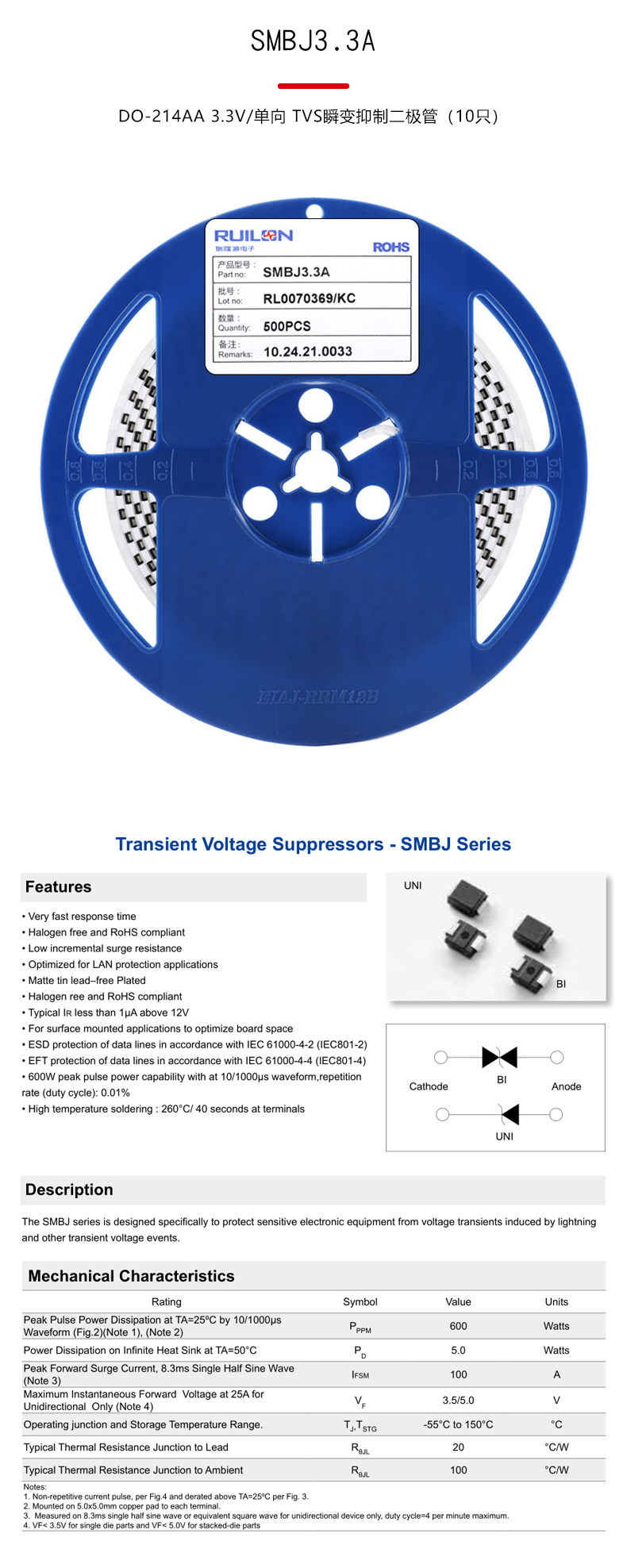 Оригинальный подлинный SMBJ3.3a DO-214AA 3.3 В/однонаправленные телевизоры Времение переходные ингибирующие ингибирующие диод 10
